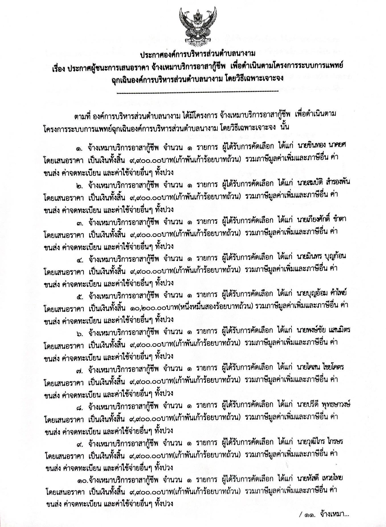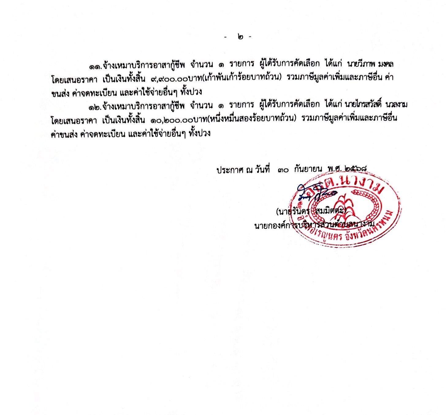 ประกาศผู้ชนะการเสนอราคา จ้างเหมาบริการอาสากู้ชีพ เพื่อดำเนินตามโครงการระบบการแพทย์ฉุกเฉินองค์การบริหารส่วนตำบลนางาม โดยเฉพาะเจาะจง