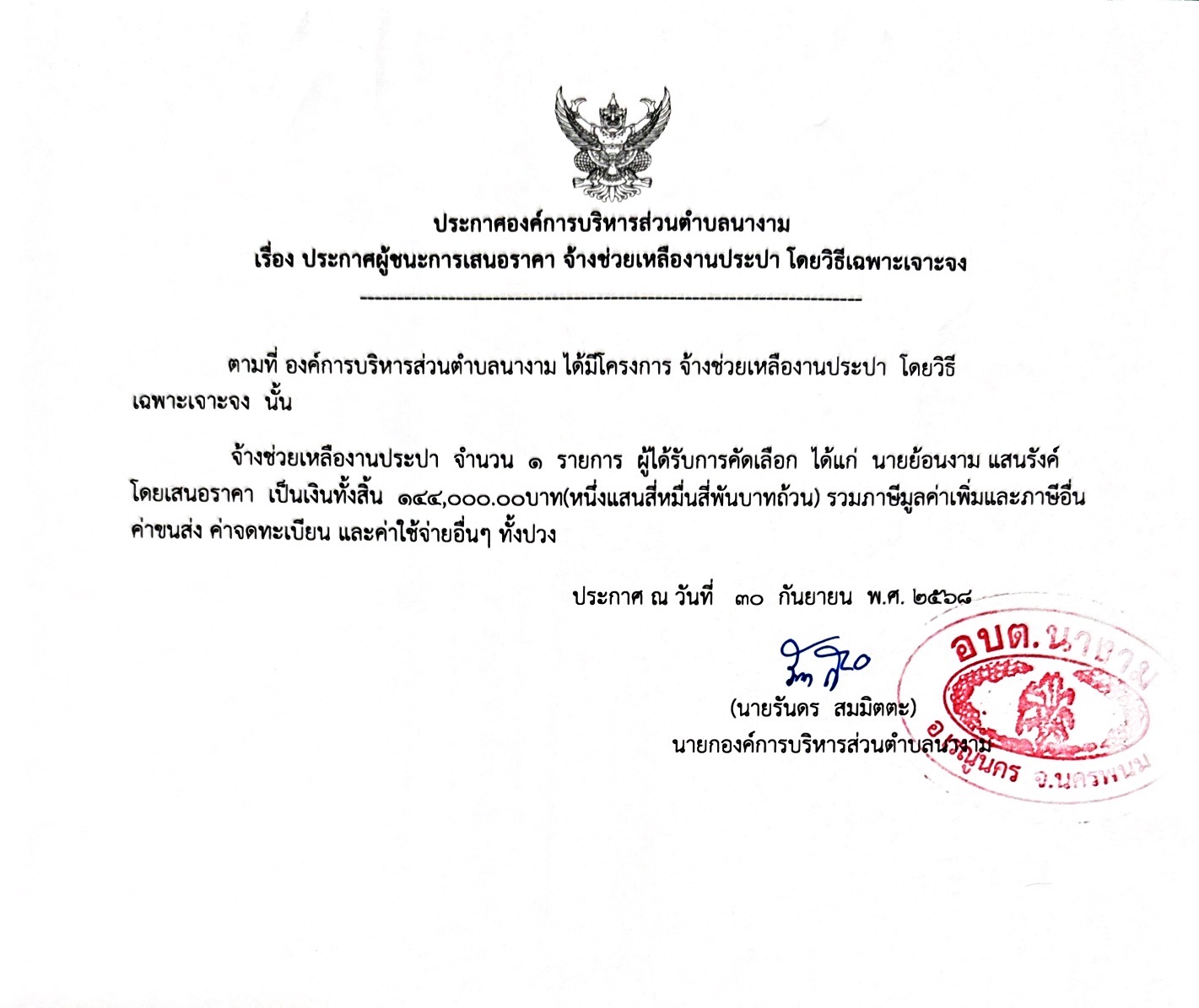 ประกาศผู้ชนะการเสนอราคา จ้างช่วยเหลืองานประปา โดยวิธีเฉพาะเจาะจง