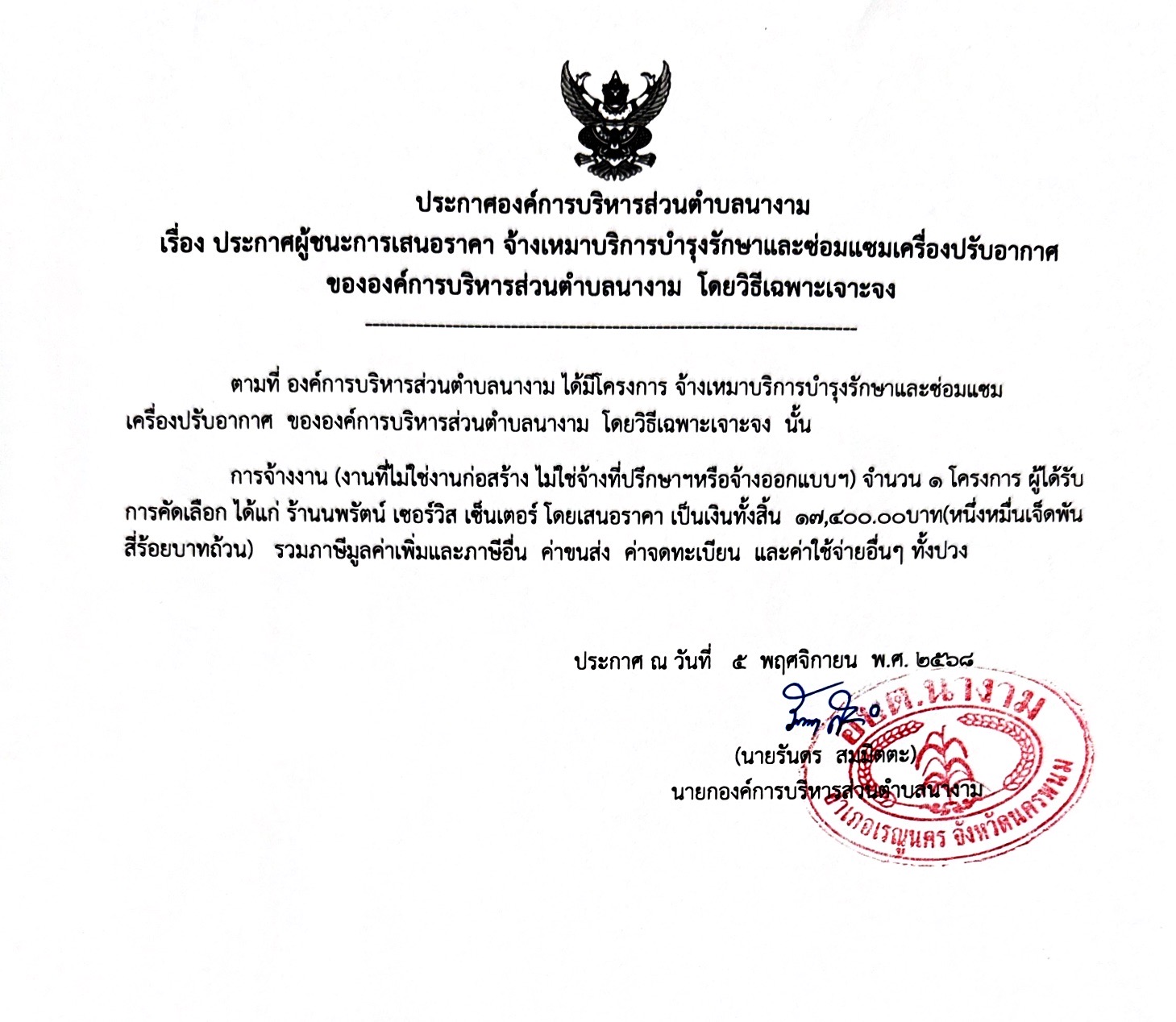 ประกาศผู้ชนะการเสนอราคา จ้างเหมาบริการบำรุงรักษาและซ่อมแซมเครื่องปรับอากาศ ขององค์การบริหารส่วนตำบลนางาม โดยวิธีเฉพาะเจาะจง