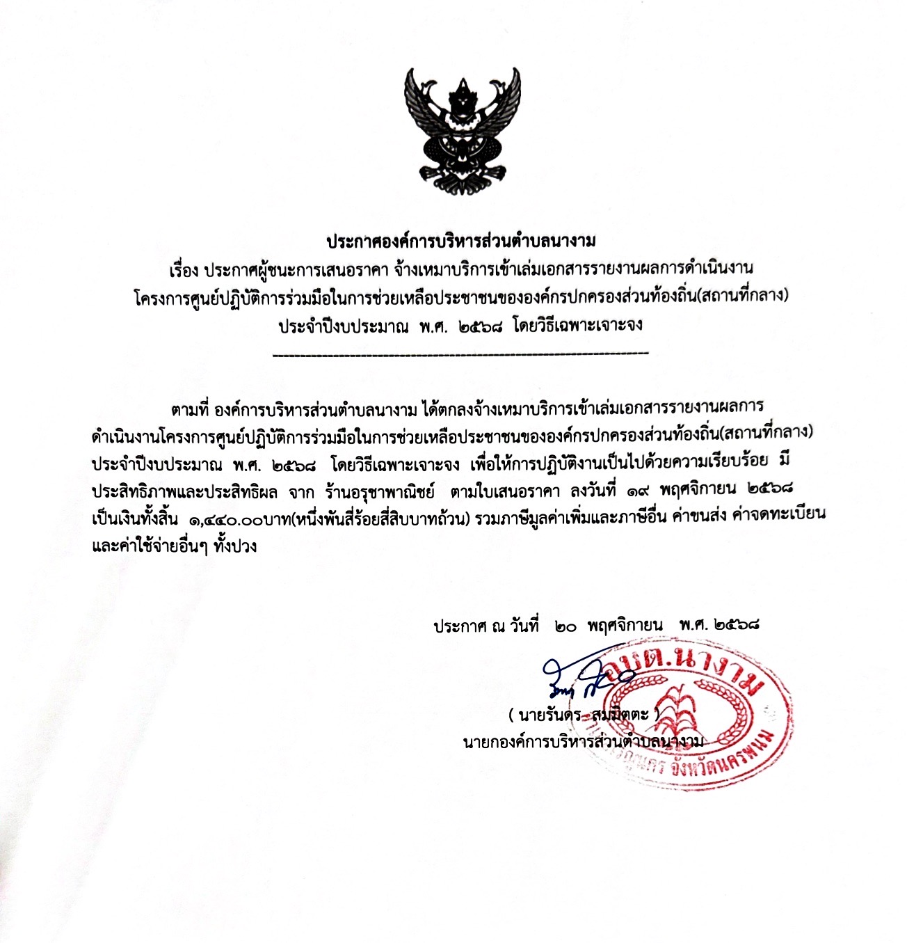 ชื่อเรื่อง : ประกาศผู้ชนะการเสนอราคา จ้างเหมาบริการเข้าเล่มเอกสารรายงานผลการดำเนินงานโครงการศูนย์ปฏิบัติการร่วมมือในการช่วยเหลือประชาชนขององค์กรปกครองส่วนท้องถิ่น(สถานที่กลาง) ประจำปีงบประมาณ พ.ศ. ๒๕๖๘ โดยวิธีเฉพาะเจาะจง
