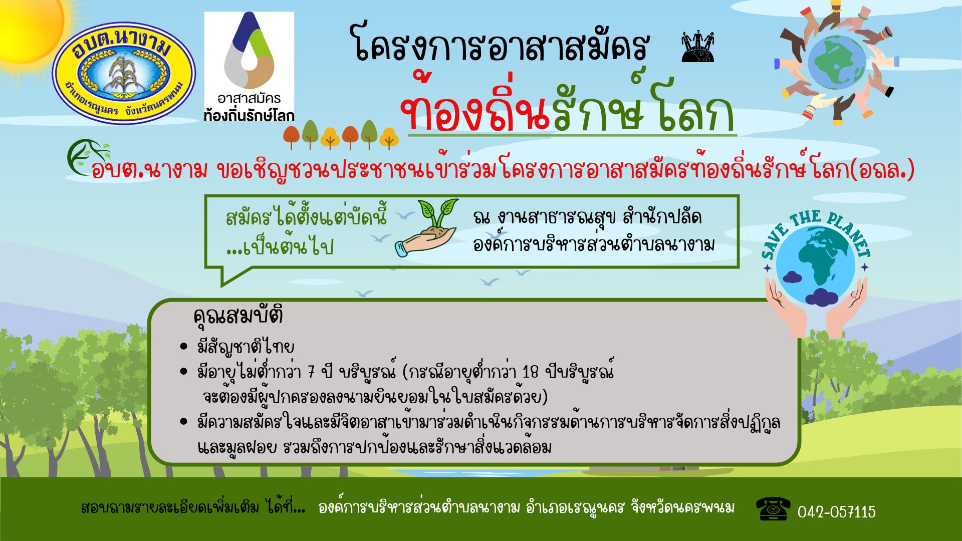 องค์การบริหารส่วนตำบลนางาม ขอเชิญชวนประชาชนเข้าร่วมโครงการอาสาสมัครท้องถิ่นรักโลก (อถล)