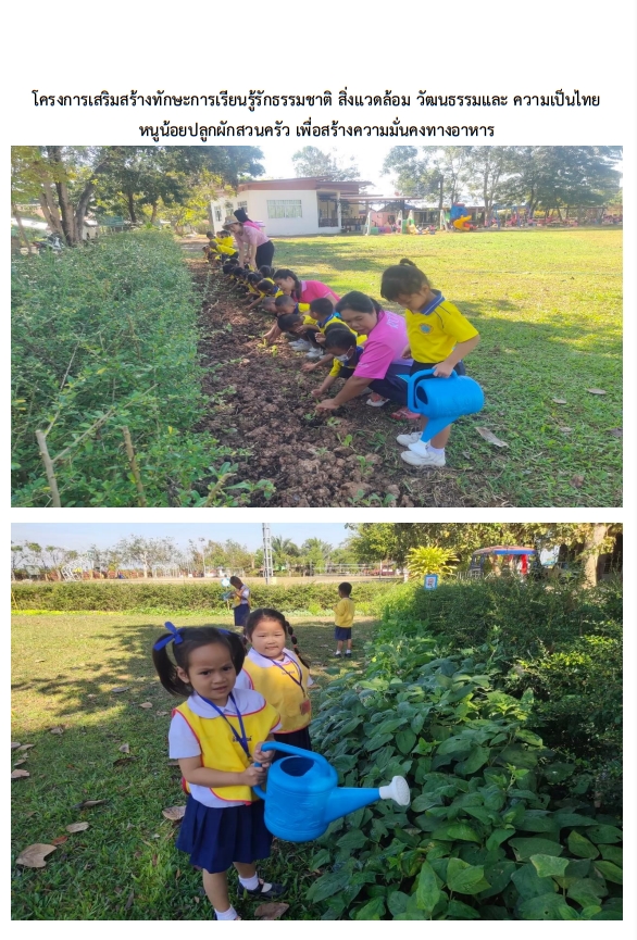 ชื่อเรื่อง : โครงการเสริมสร้างทักษะการเรียนรู้รักธรรมชาติ สิ่งแวดล้อม วัฒนธรรมและ ความเป็นไทย หนูน้อยปลูกผักสวนครัว เพื่อสร้างความมั่นคงทางอาหาร