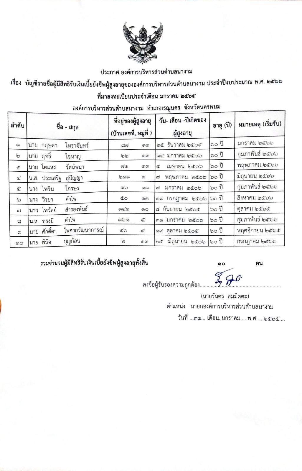 ประกาศบัญชีรายชื่อผู้มีสิทธิ์รับเงินเบี้ยยังชีพผู้สูงอายุขององค์การบริหารส่วนตำบลนางาม ประจำปีงบประมาณ พ.ศ. 2566 ที่มาลงทะเบียนเดือน มกราคม 2565