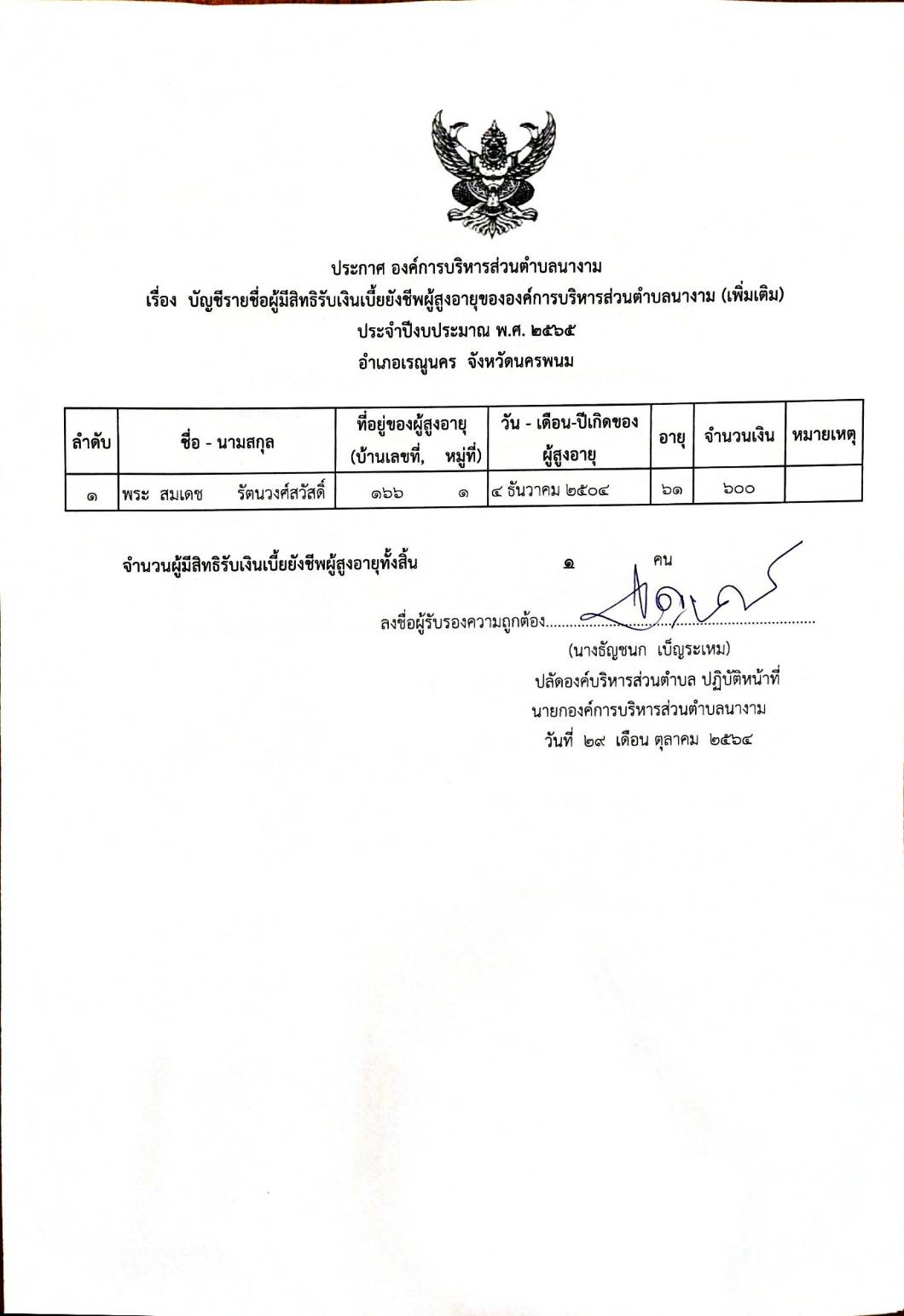 ชื่อเรื่อง : ประกาศบัญชีรายชื่อผู้มีสิทธิรับเงินเบี้ยยังชีพผู้สูงอายุขององค์การบริหารส่วนตำบลนางาม (เพิ่มเติม) ประจำปีงบประมาณ พ.ศ. 2565