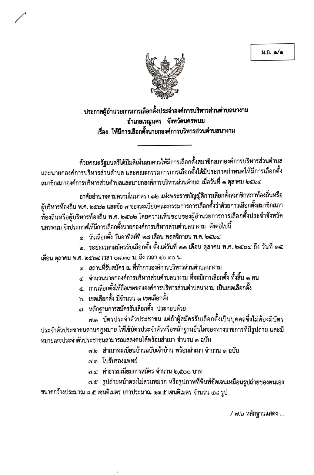 องค์การบริหารส่วนตำบลนางาม อำเภอเรณูนคร จังหวัดนครพนม ได้ออกประกาศผู้อำนวยการการเลือกตั้งประจำองค์การบริหารส่วนตำบลนางาม อำเภอเรณูนคร จังหวัดนครพนม เรื่อง ให้มีการเลือกตั้งนายกองค์การบริหารส่วนตำบลนางาม โดยกำหนดรับสมัครเลือกตั้ง ตั้งแต่วันที่ 11 - 15 ตุลาคม 2564 รายละเอียดตามประกาศที่แนบมาพร้อมนี้ สามารถขอเอกสารเพิ่มเติมได้ที่ ที่ทำการองค์การบริหารส่วนตำบลนางาม โทร. 042-057115 หรือที่ www.nangam.go.th