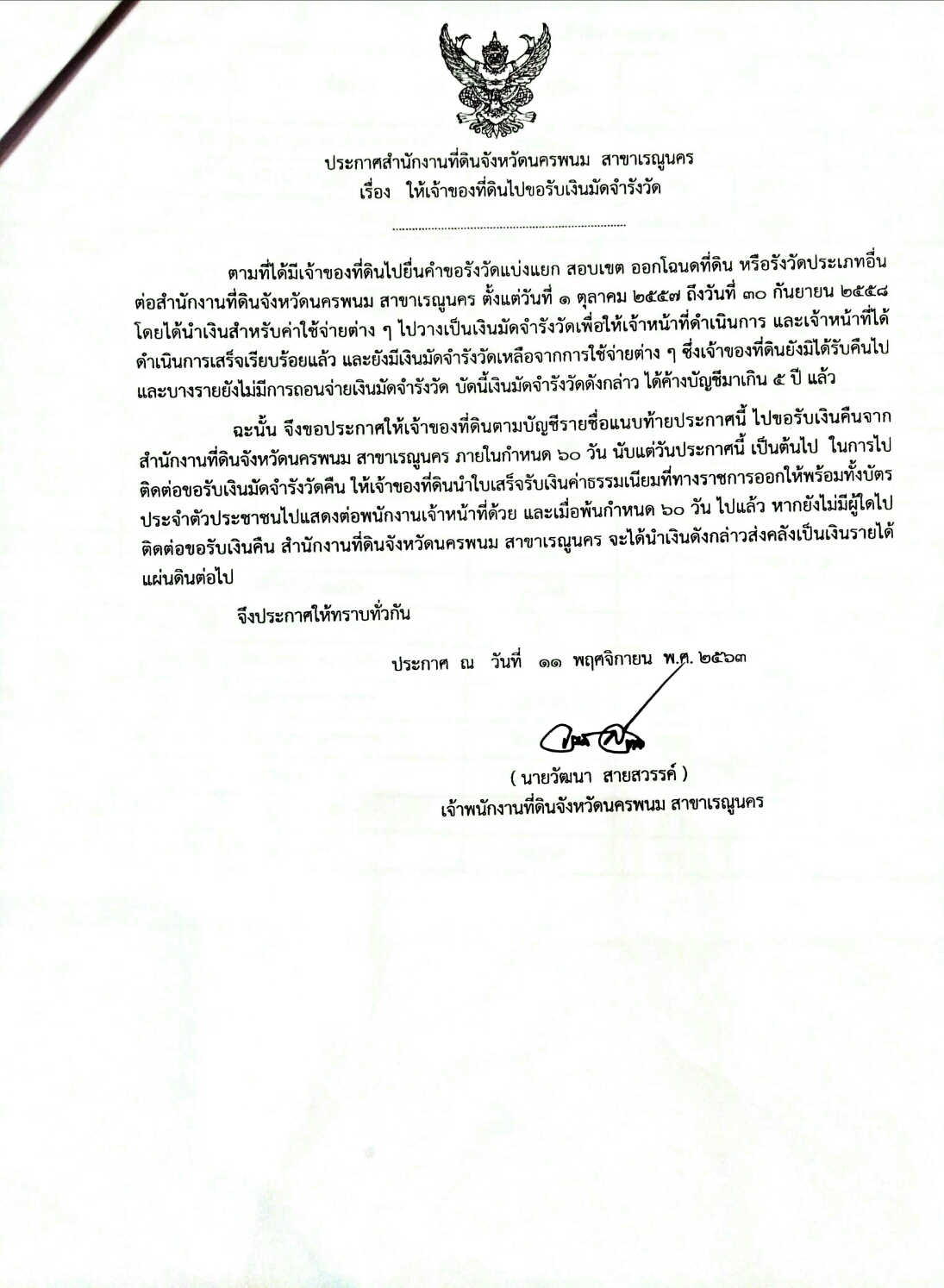 ชื่อเรื่อง : ประกาศสำนักงานที่ดินจังหวัดนครพนม สาขาเรณูนคร
