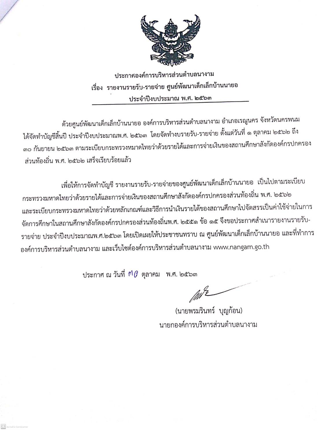 รายงานรายรับ - รายจ่าย ศูนย์พัฒนาเด็กเล็กบ้านนายอ ประจำปีงบประมาณ พ.ศ. 2563