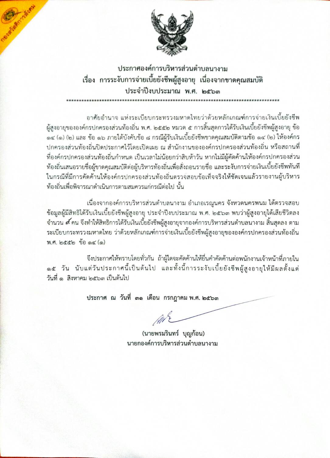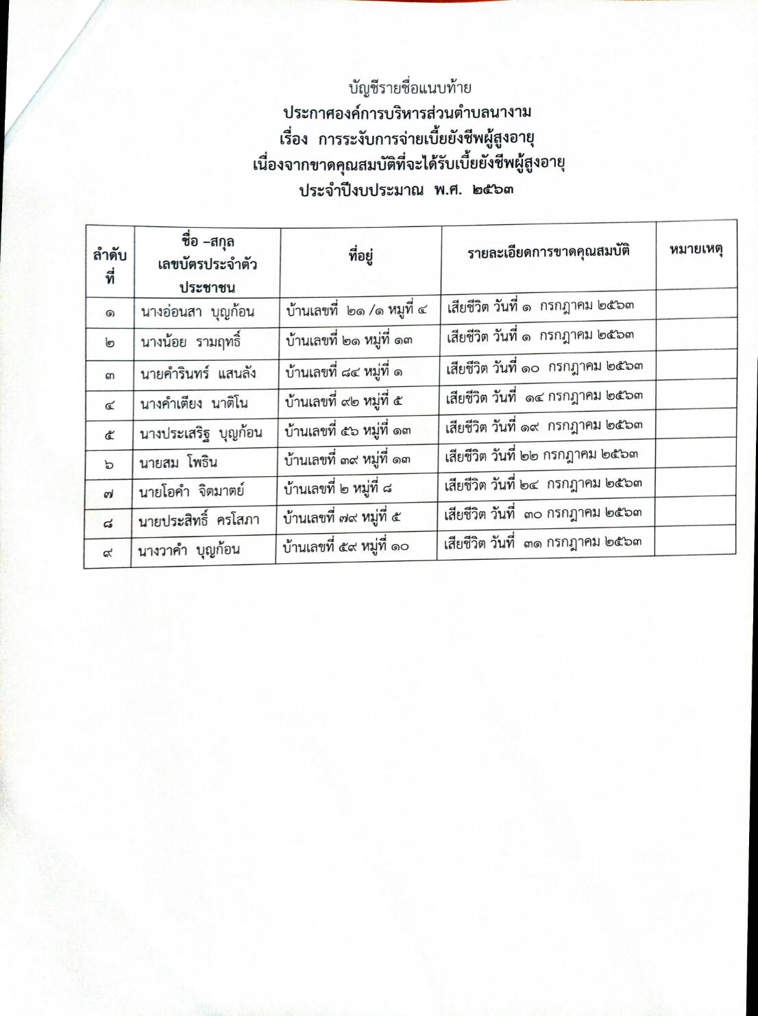 ชื่อเรื่อง : ประกาศ องค์การบริหารส่วนตำบลนางาม เรื่อง การระงับจ่ายเบี้ยยังชีพผู้สูงอายุ เนื่องจากขาดคุณสมบัติ ประจำปีงบประมาณ พ.ศ. 2563