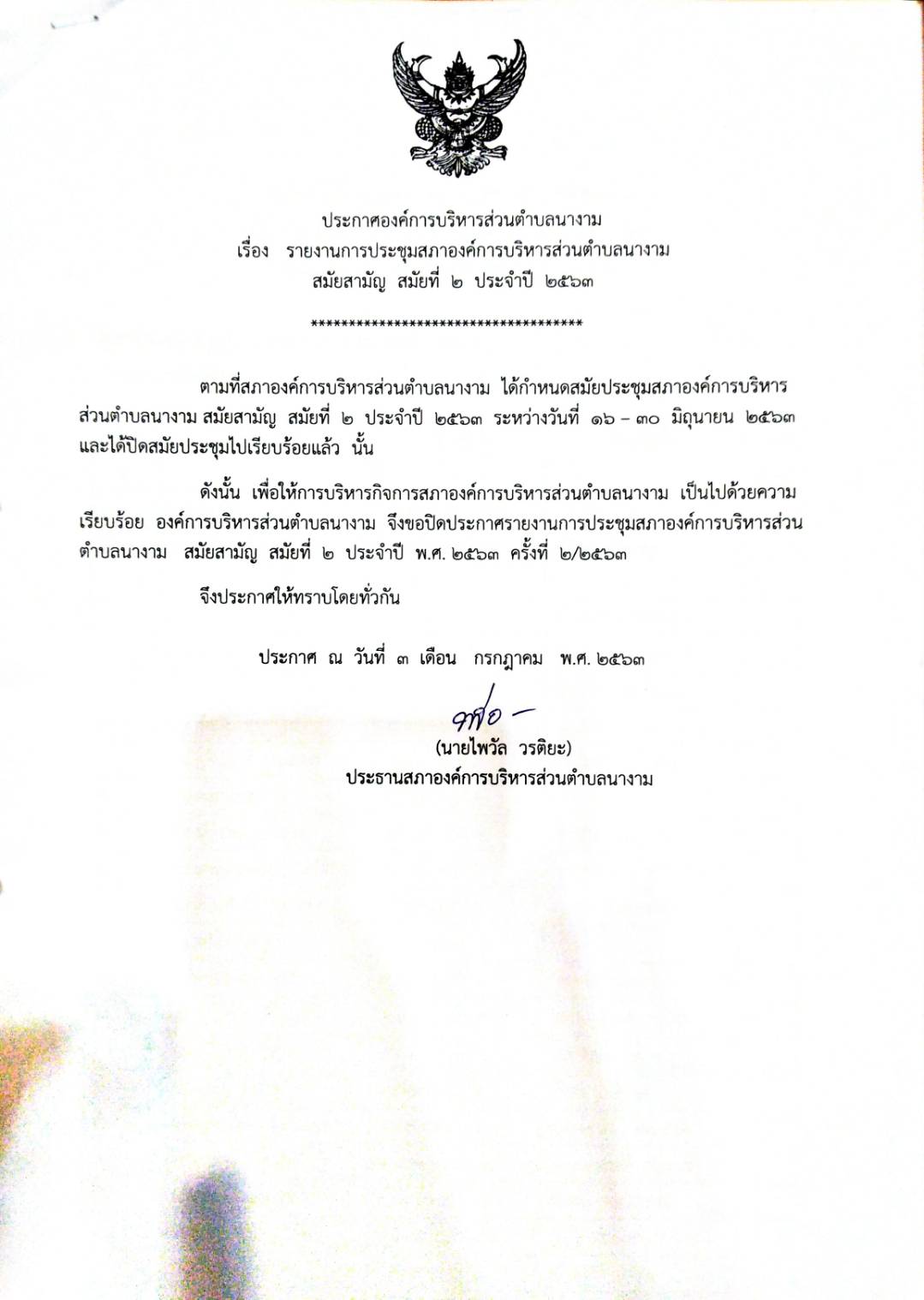 ชื่อเรื่อง : ประกาศองค์การบริหารส่วนตำบลนงาม เรื่อง รายงานการประชุมสภาองค์การบริหารส่วนตำบลนางาม สมัยสามัญสมัยที่ 2 ประจำปี 2563