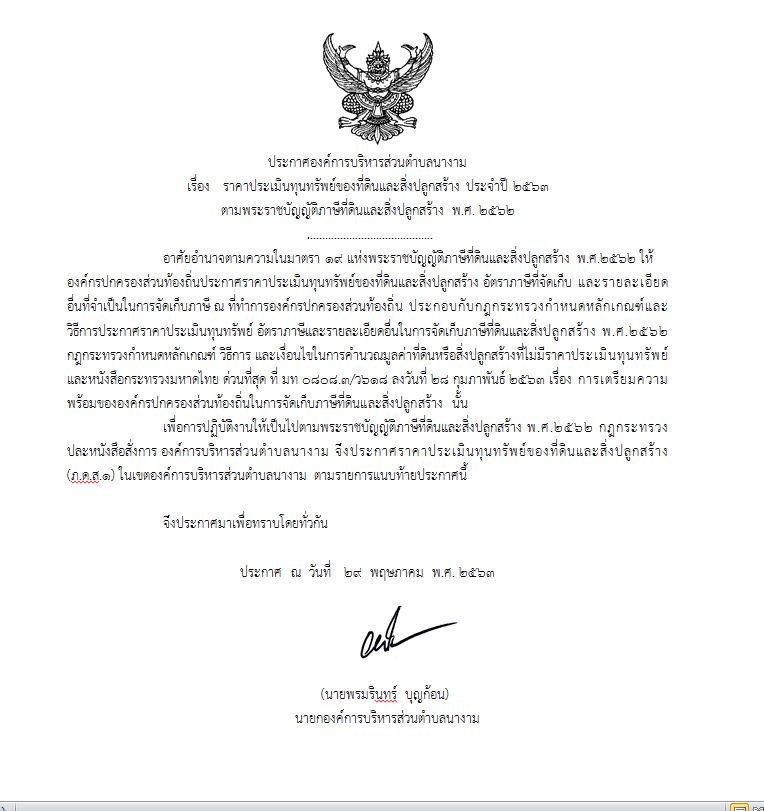 ประกาศมราคาประเมินทุนทรัพย์ของที่ดินและสิ่งปลูกสร้าง ประจำปี 2563