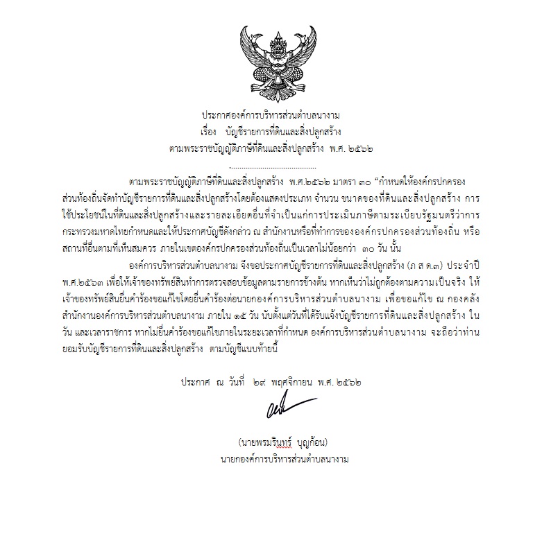 ชื่อเรื่อง : ประกาศบัญชีรายการที่ดินและสิ่งปลูกสร้าง (ภ.ส.ด.3)