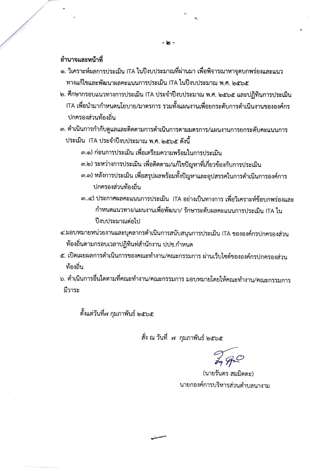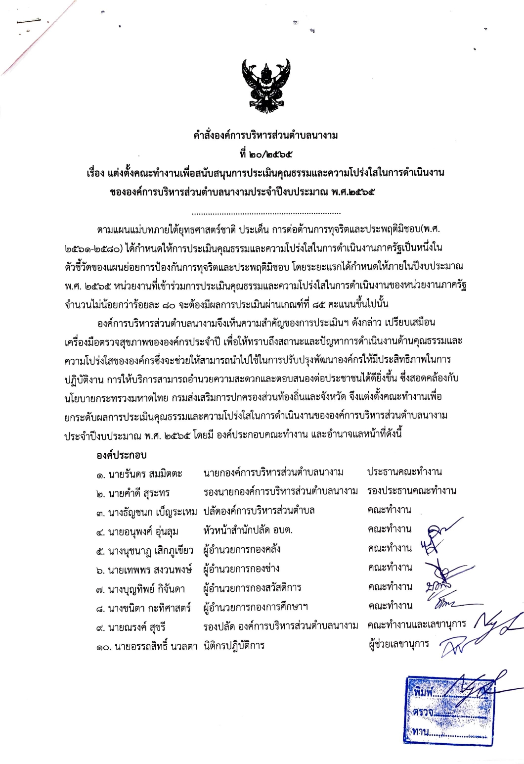 ชื่อเรื่อง : คำสั่ง แต่งตั้งคณะทำงานเพื่อสนับสนุนการประเมินคุณะรรมและความโปร่งใส่ขององค์การบริหารส่วนตำบลนางาม ประจำปี พ.ศ. 2565