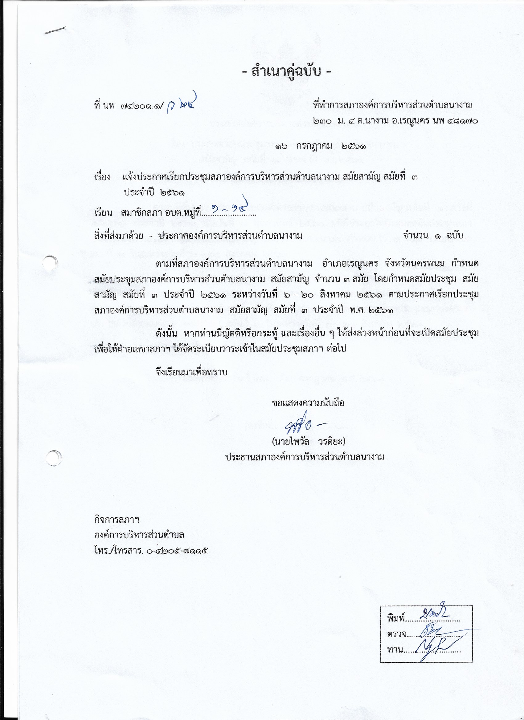 เรื่อง แจ้งการเรียกประชุมสภาองค์การบริหารส่วนตำบลนางาม สมัยสามัญ สมัยที่ 3 ประจำปี 2561