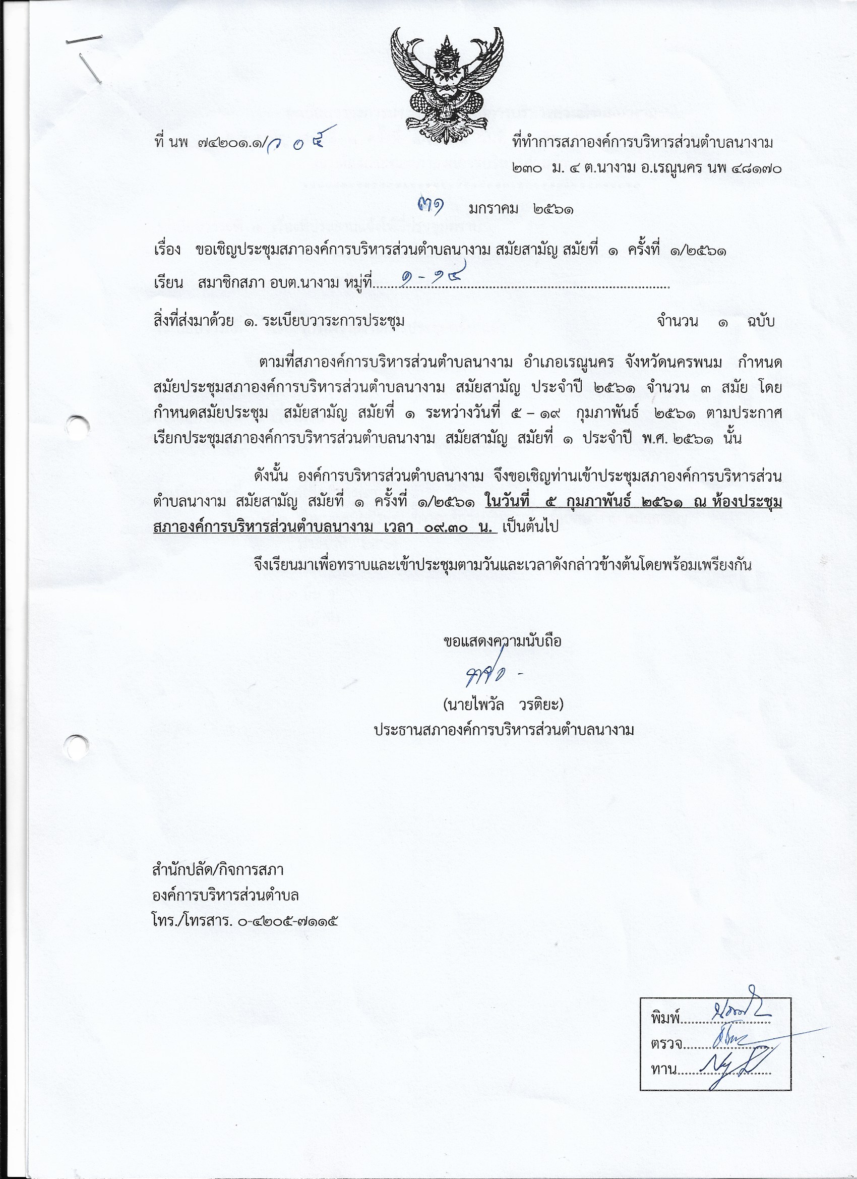 ชื่อเรื่อง : เรื่อง ขอเชิญประชุมสภาองค์การบริหารส่วนตำบลนางาม สมัยสามัญ สมัยที่ 1 ครั้งที่ 1/2561