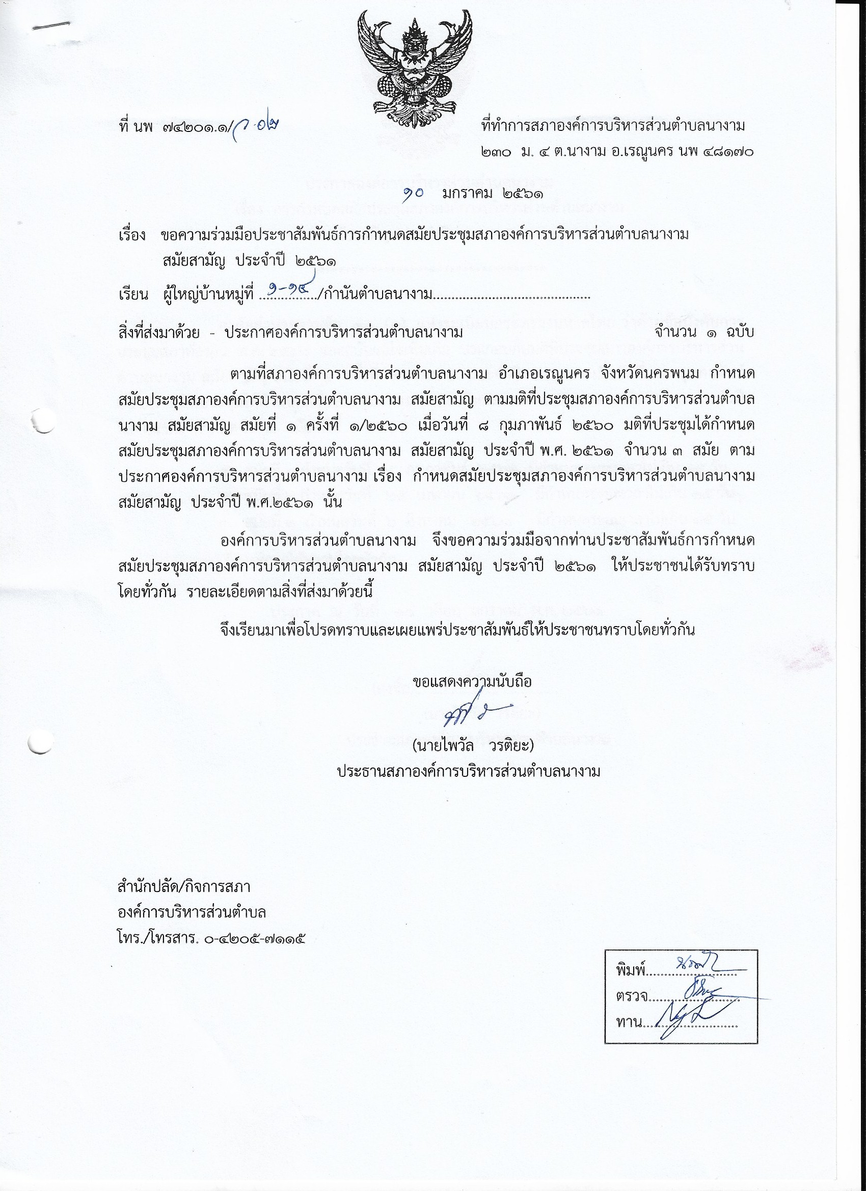 ชื่อเรื่อง : ขอความร่วมมือประชาสัมพันธ์การกำหนดสมัยประชุมสภาองค์การบริหารส่วนตำบลนางาม สมัยสามัญ ประจำปี 2561