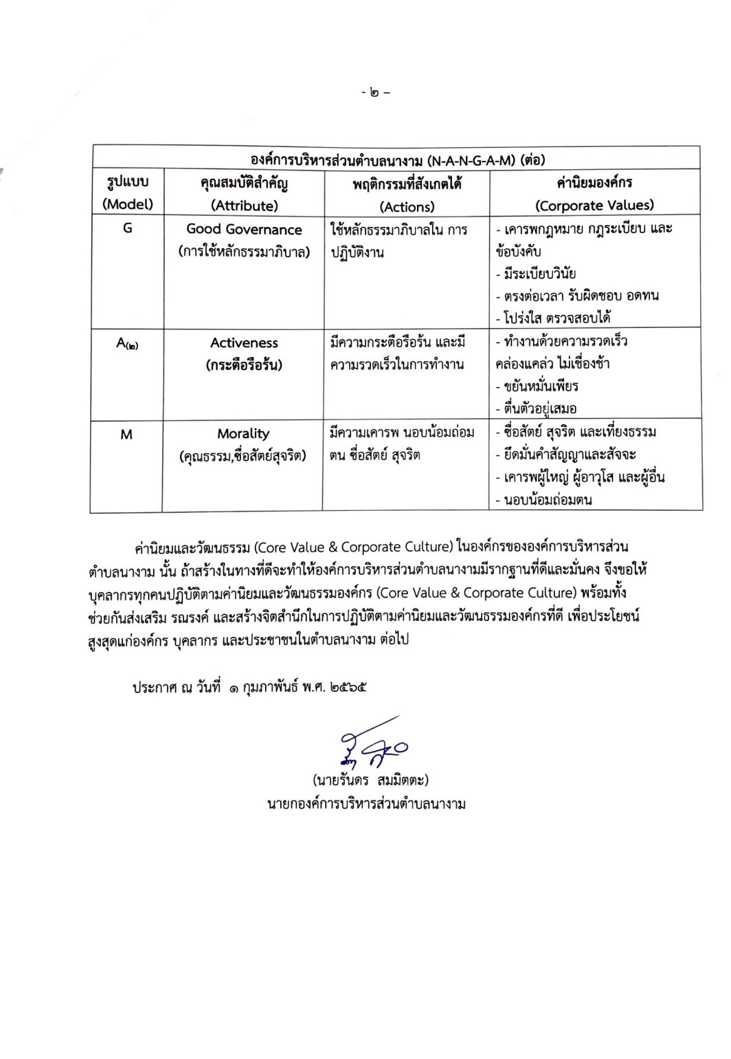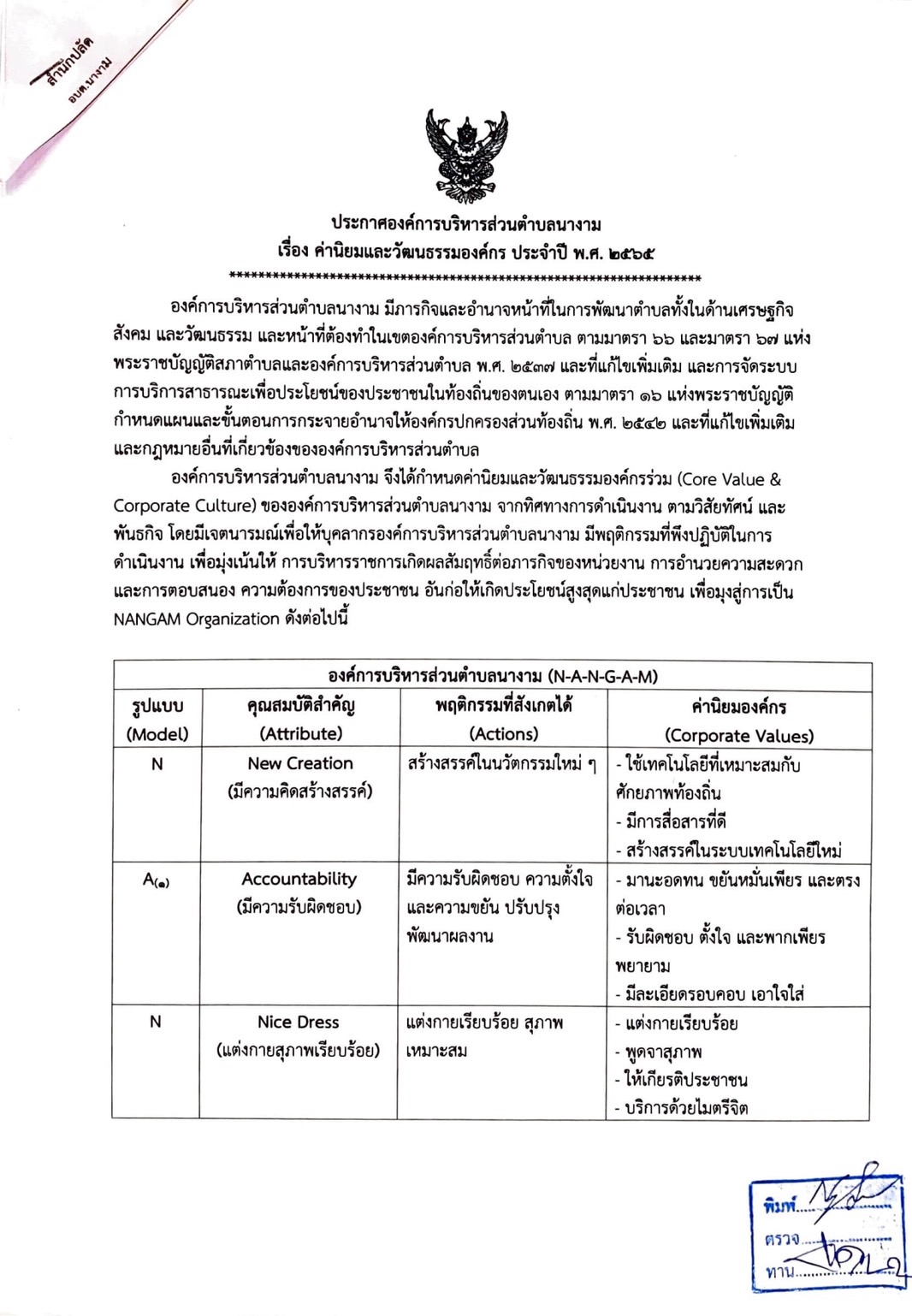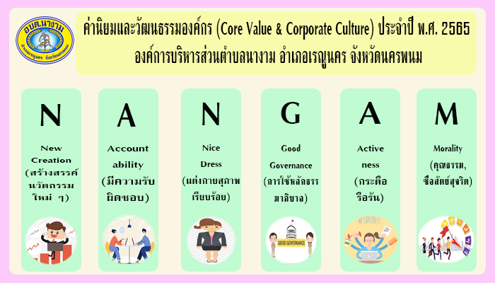 ประกาศองค์การบริหารส่วนตำบลนางาม เรื่อง ค่านิยมและวัฒนธรรมองค์กร (Core Value & Corporate Culture) ประจำปี พ.ศ. 2565