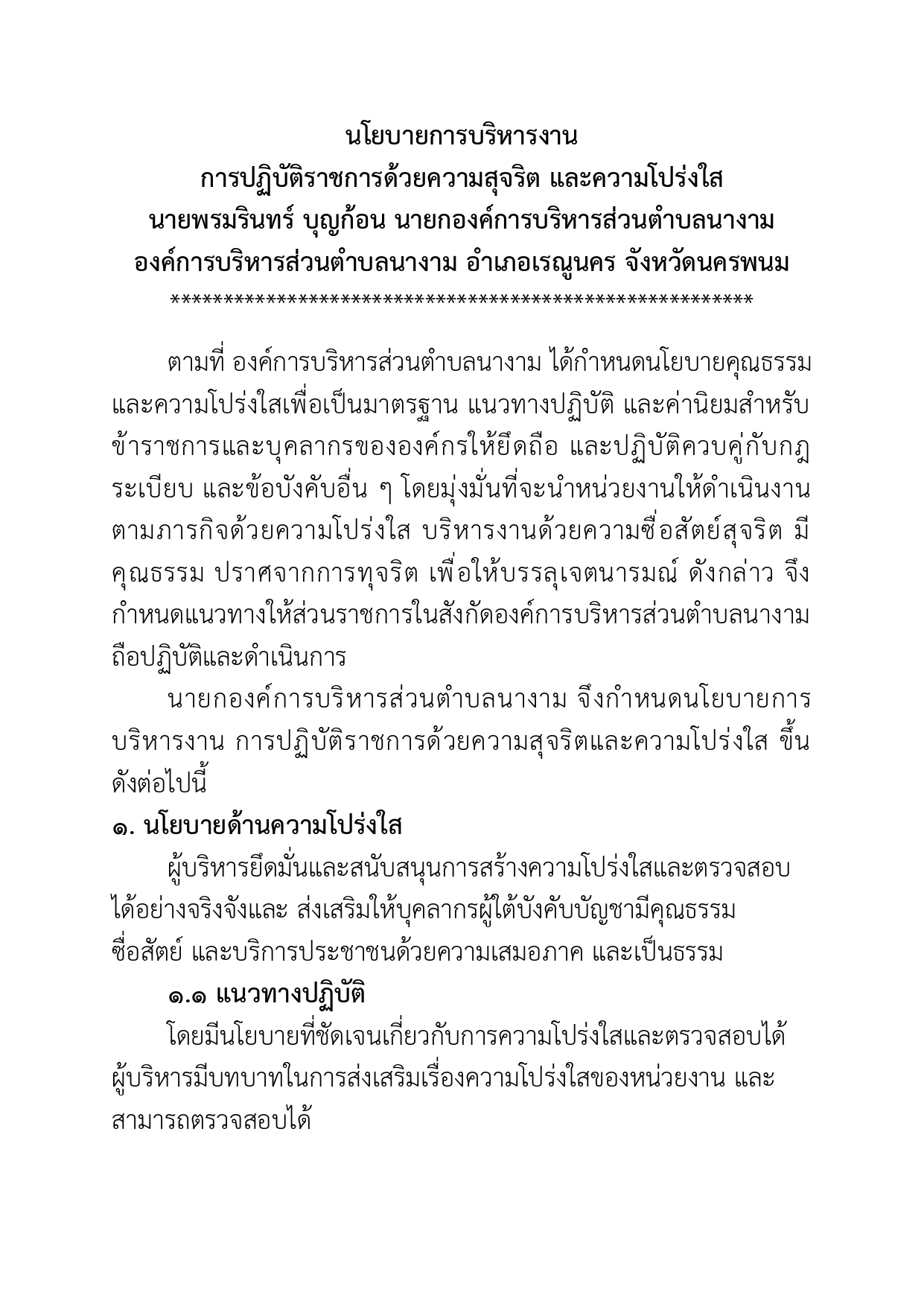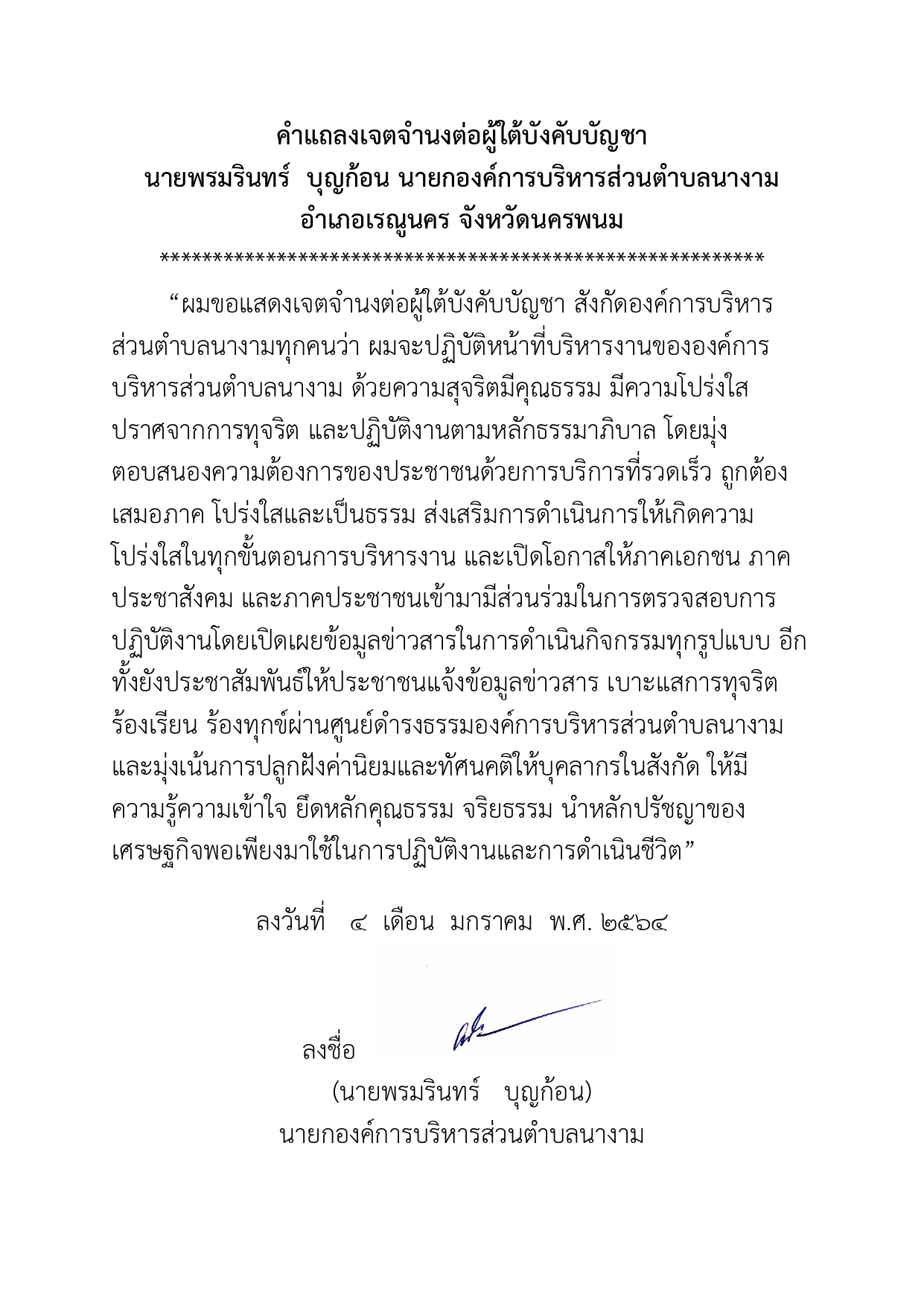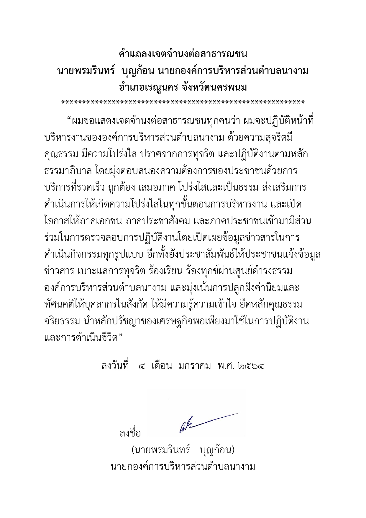 ประกาศเจตนารมณ์การต่อต้านการทุจริต อบต.นางามใส่สะอาด รว่มต้านทุจริต ประจำปี พ.ศ. 2564