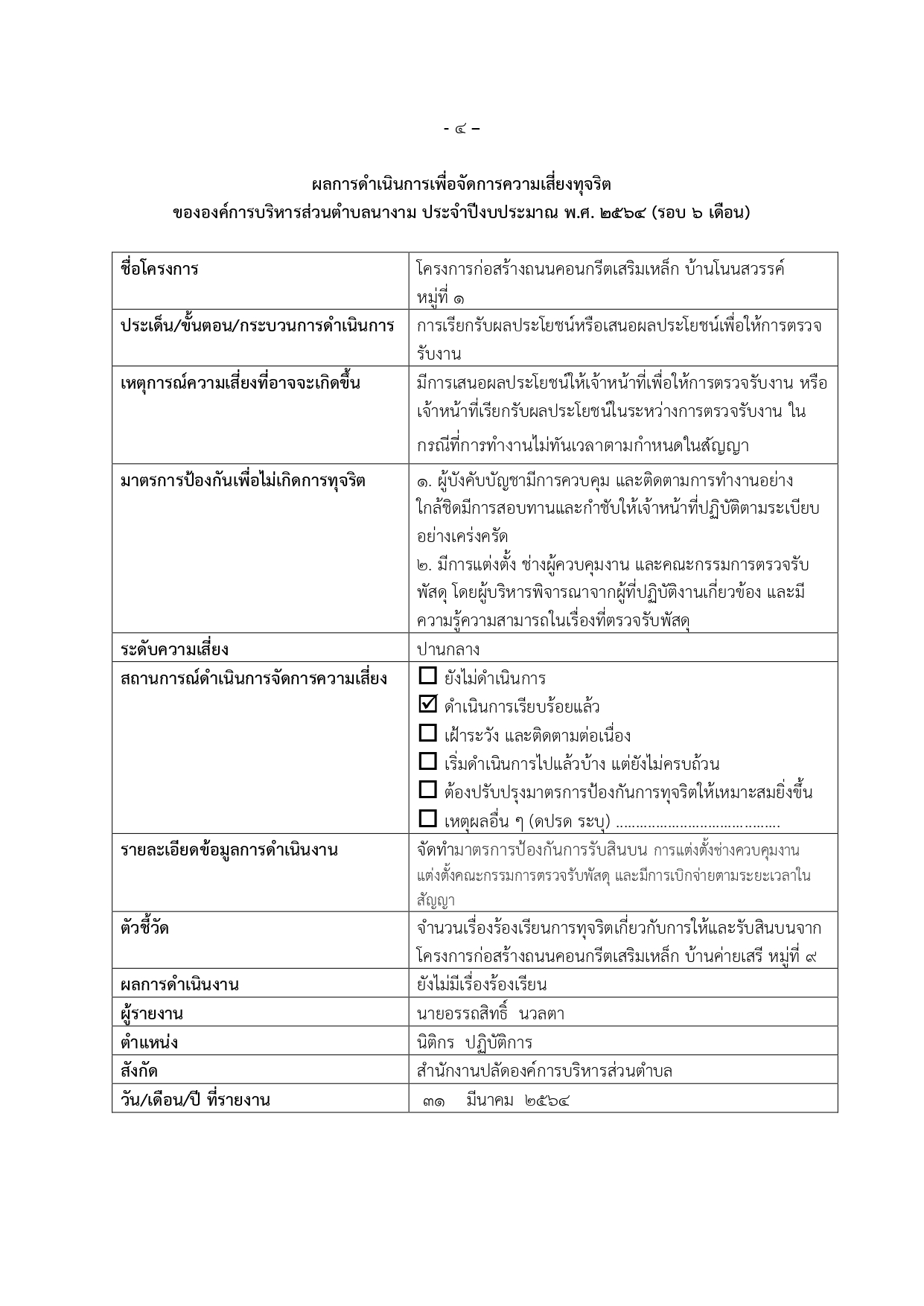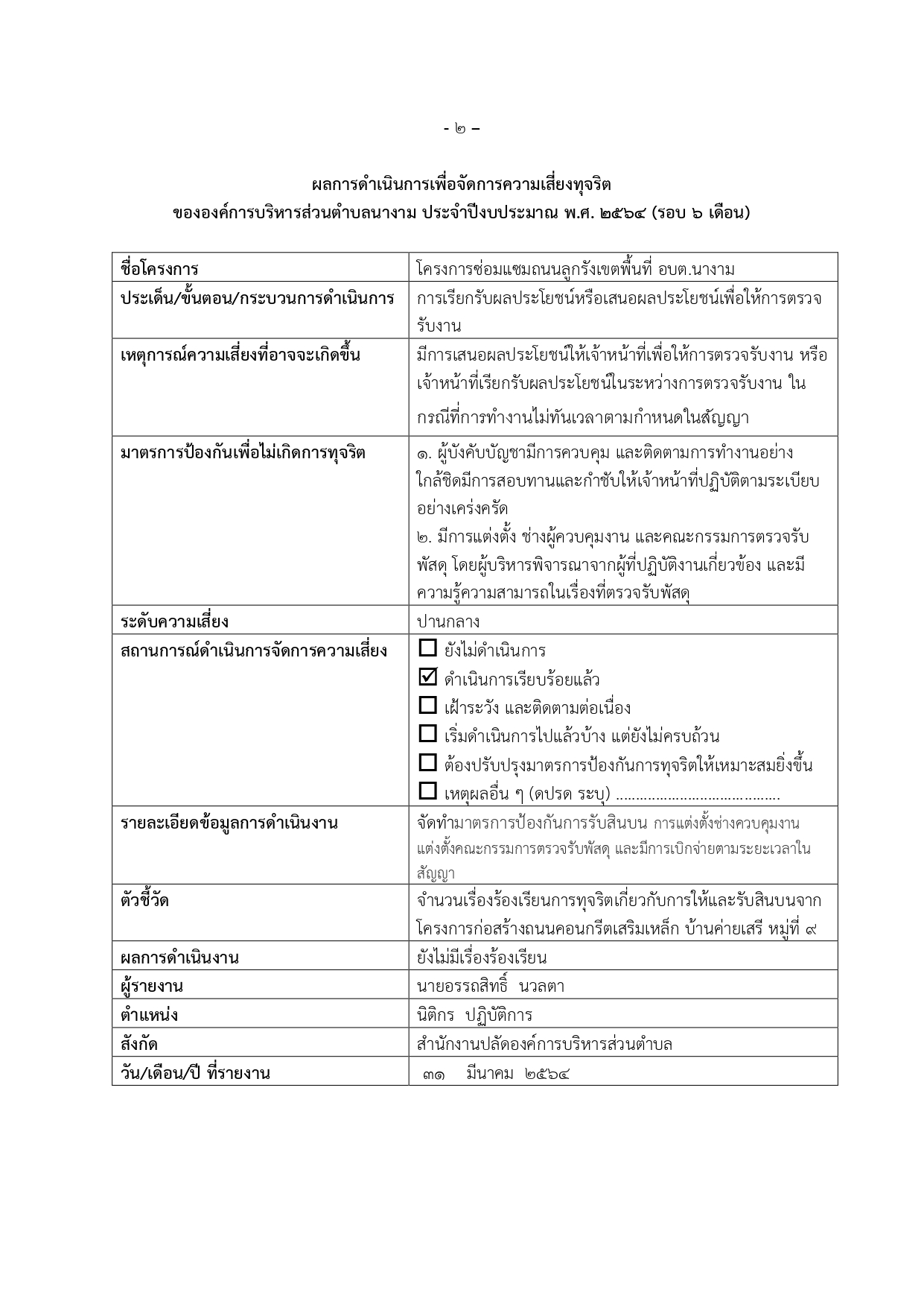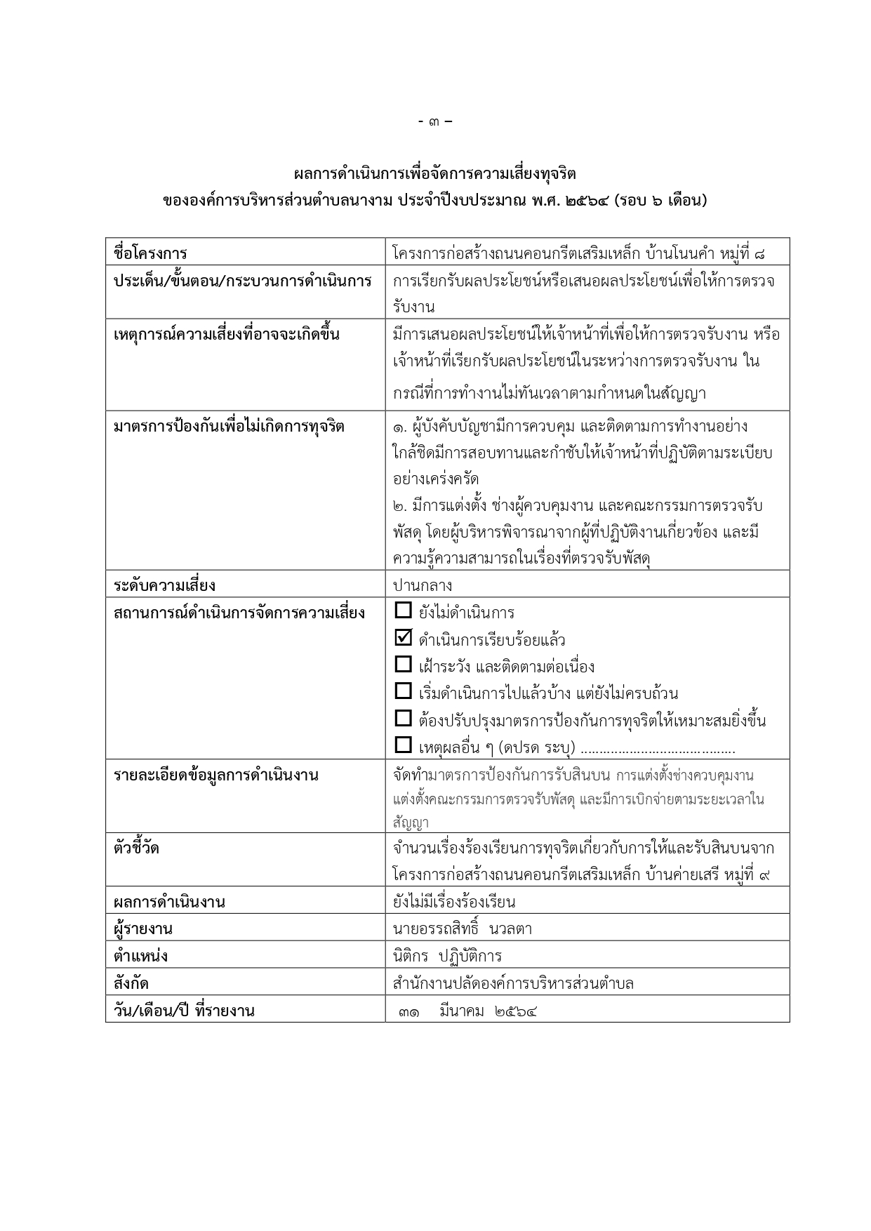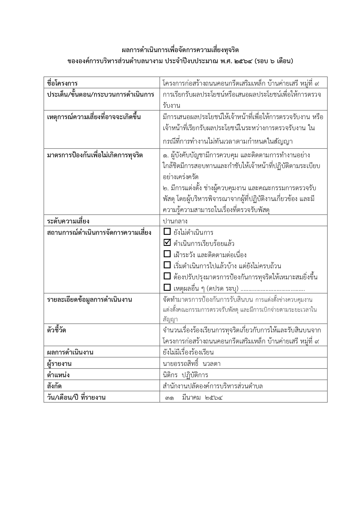ชื่อเรื่อง : ผลการดำเนินการเพื่อจัดการความเสี่ยงทุจริต ประจำปีงบประมาณ พ.ศ. 2564 (รอบ 6 เดือน)