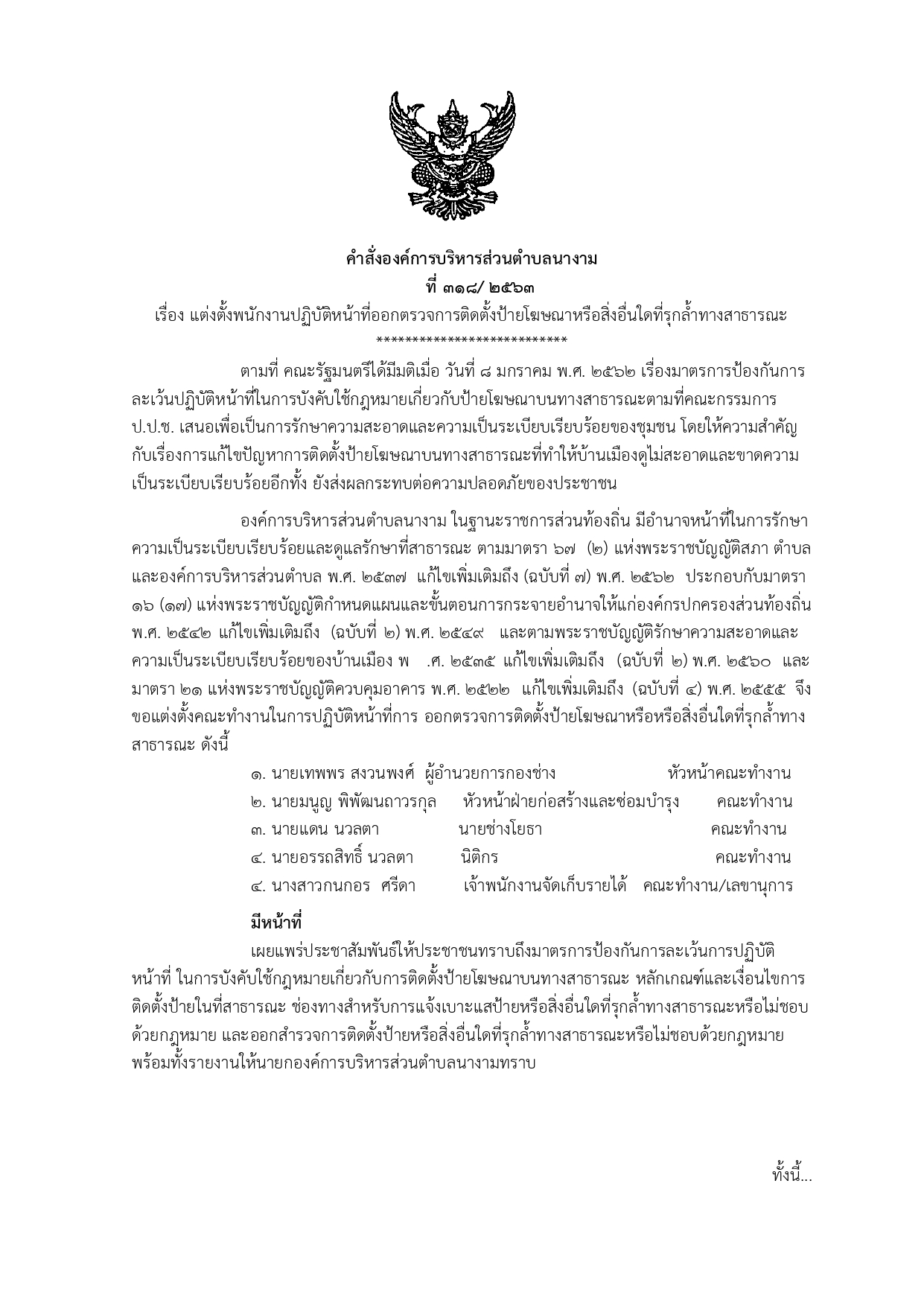คำสั่ง เรื่อง แต่งตั้งพนักงานปฏิบัติหน้าที่ออกตรวจการติดตั้งป้ายโฆษณาหรือสิ่งอื่นใดที่รุกล้าทางสาธารณะ