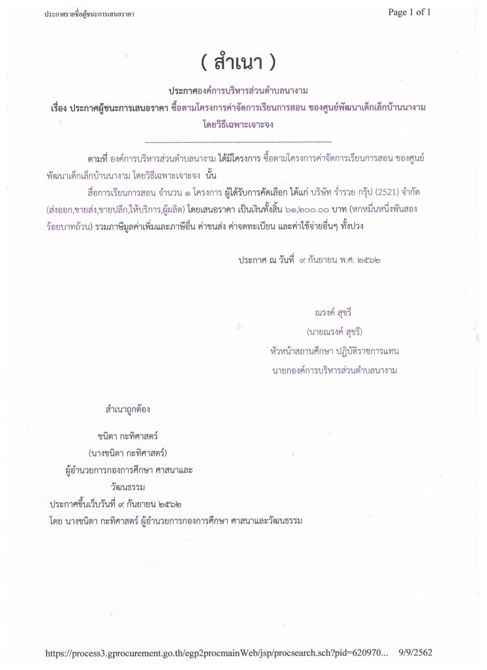 ประกาศผู้ชนะการเสนอราคา ซื้อตามโครงการค่าจัดการเรียนการสอน ของศูนย์พัฒนาเด็กเล็กบ้านนางาม โดยวิธีเฉพาะเจาะจง