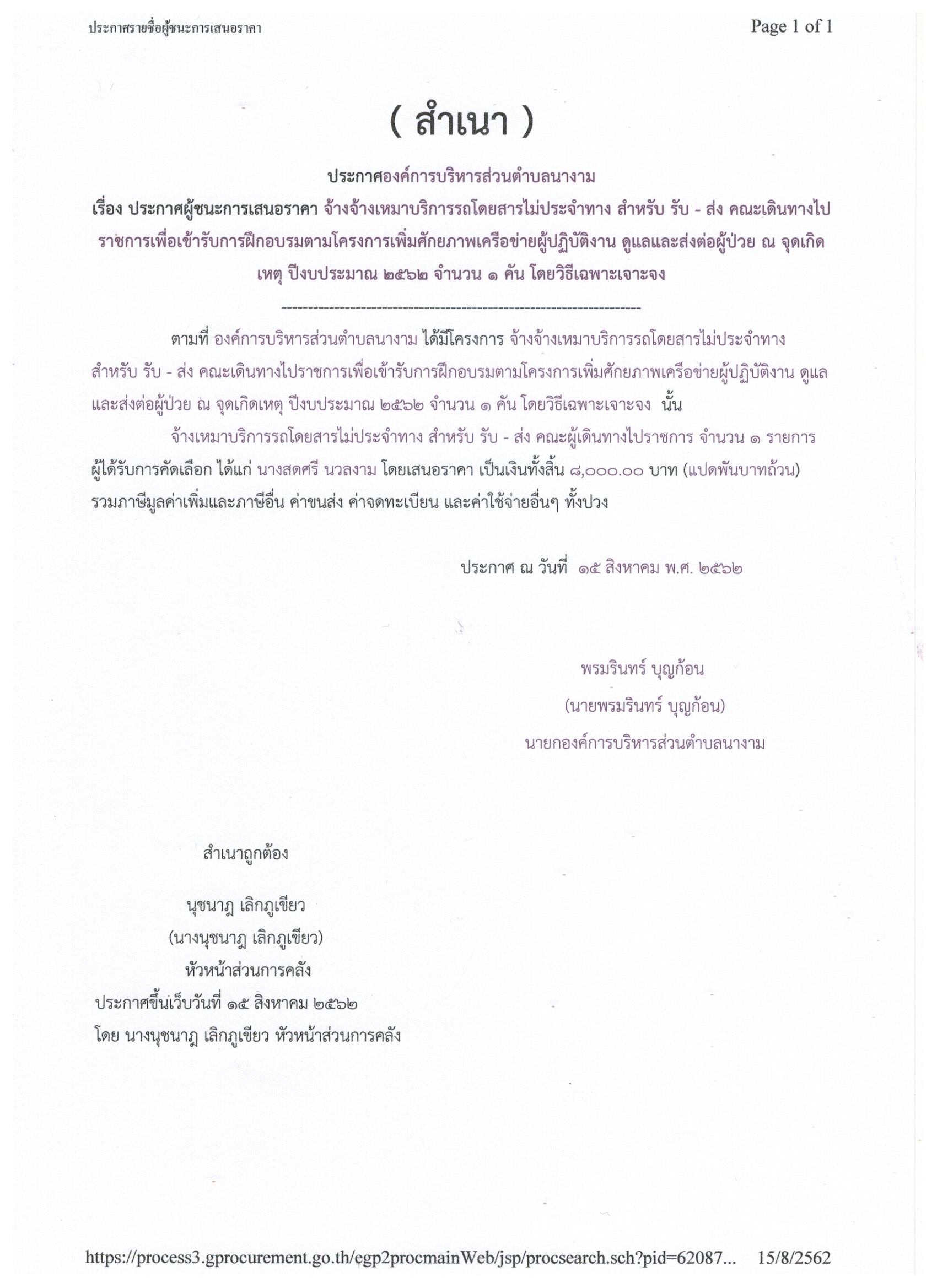 ชื่อเรื่อง : ประกาศผู้ชนะการเสนอราคา จ้างเหมาบริการรถโดยสารไม่ประจำทาง สำหรับ รับ – ส่ง คณะเดินทางไปราชการเพื่อเข้ารับการฝึกอบรมตามโครงการเพิ่มศักยภาพเครือข่ายผู้ปฏิบัติงาน ดูแลและส่งต่อผู้ป่วย ณ จุดเกิดเหตุ ปีงบประมาณ ๒๕๖๒ จำนวน ๑ คัน โดยวิธีเฉพาะเจาะจง