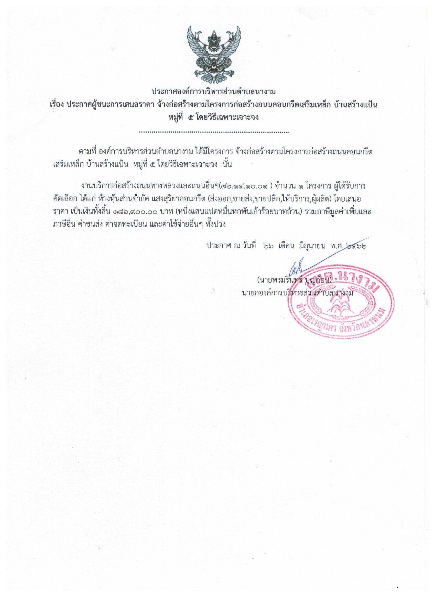 ประกาศผู้ชนะการเสนอราคาจ้างตามโครงการก่อสร้างถนนคอนกรีตเสริมเหล็ก บ้านสร้างแป้น หมู่ที่ 5 โดยวิธีเฉพาะเจาะจง