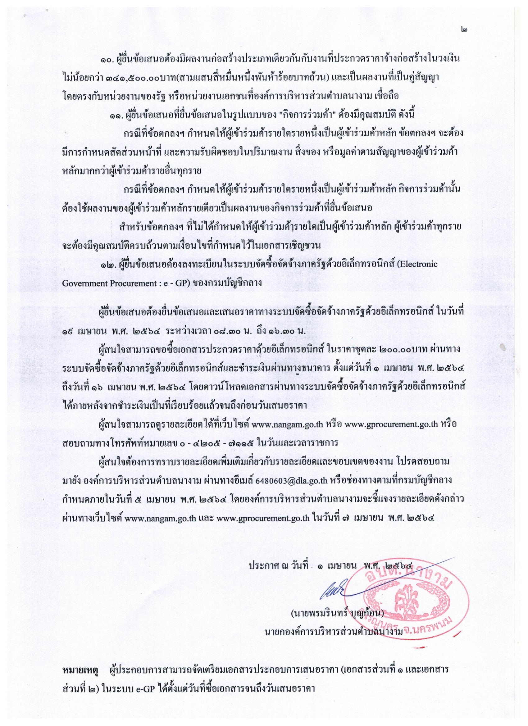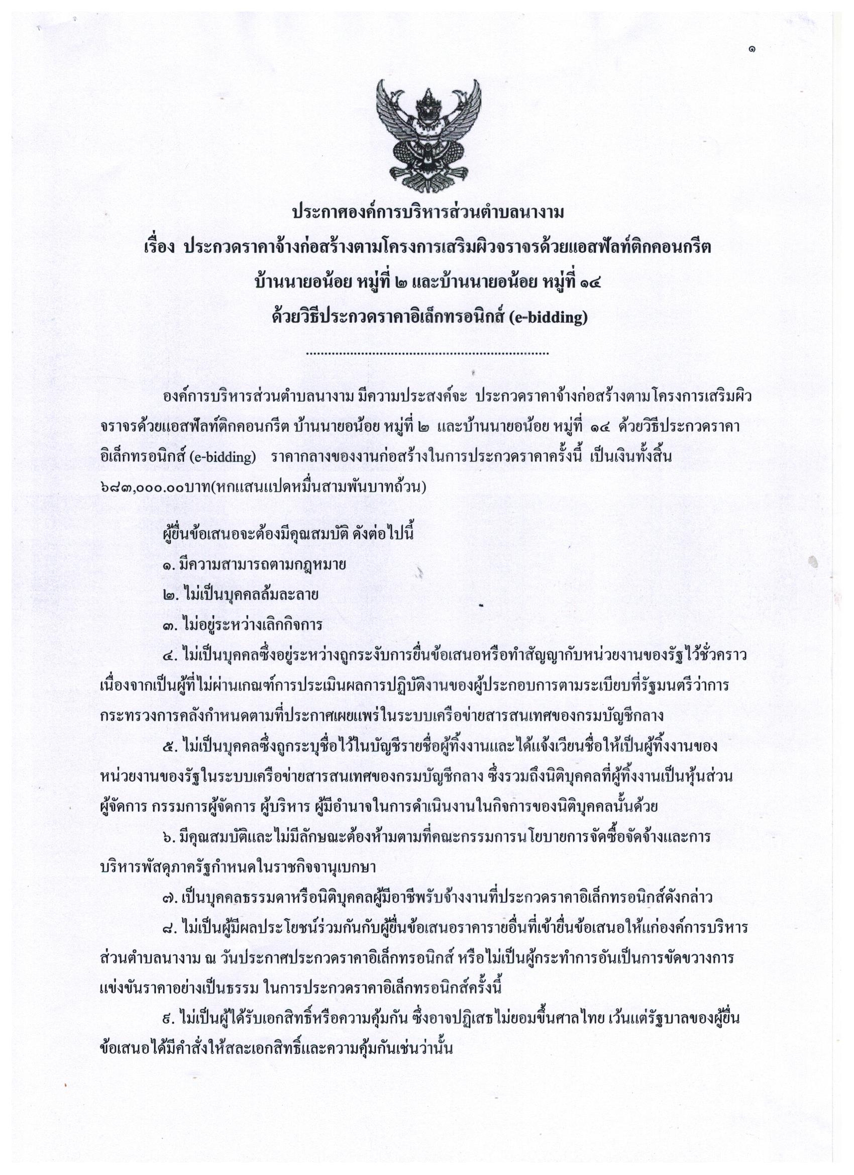 ชื่อเรื่อง : ประกาศ เรื่อง ประกวดราคาจ้างก่อสร้างตามโครงการเสริมผิวจราจรด้วยแอสฟัลท์ติกคอนกรีต บ้านนายอน้อย หมู่ที่ ๒ และบ้านนายอน้อย หมู่ที่ ๑๔ ด้วยวิธีประกวดราคาอิเล็กทรอนิกส์ (e-bidding)