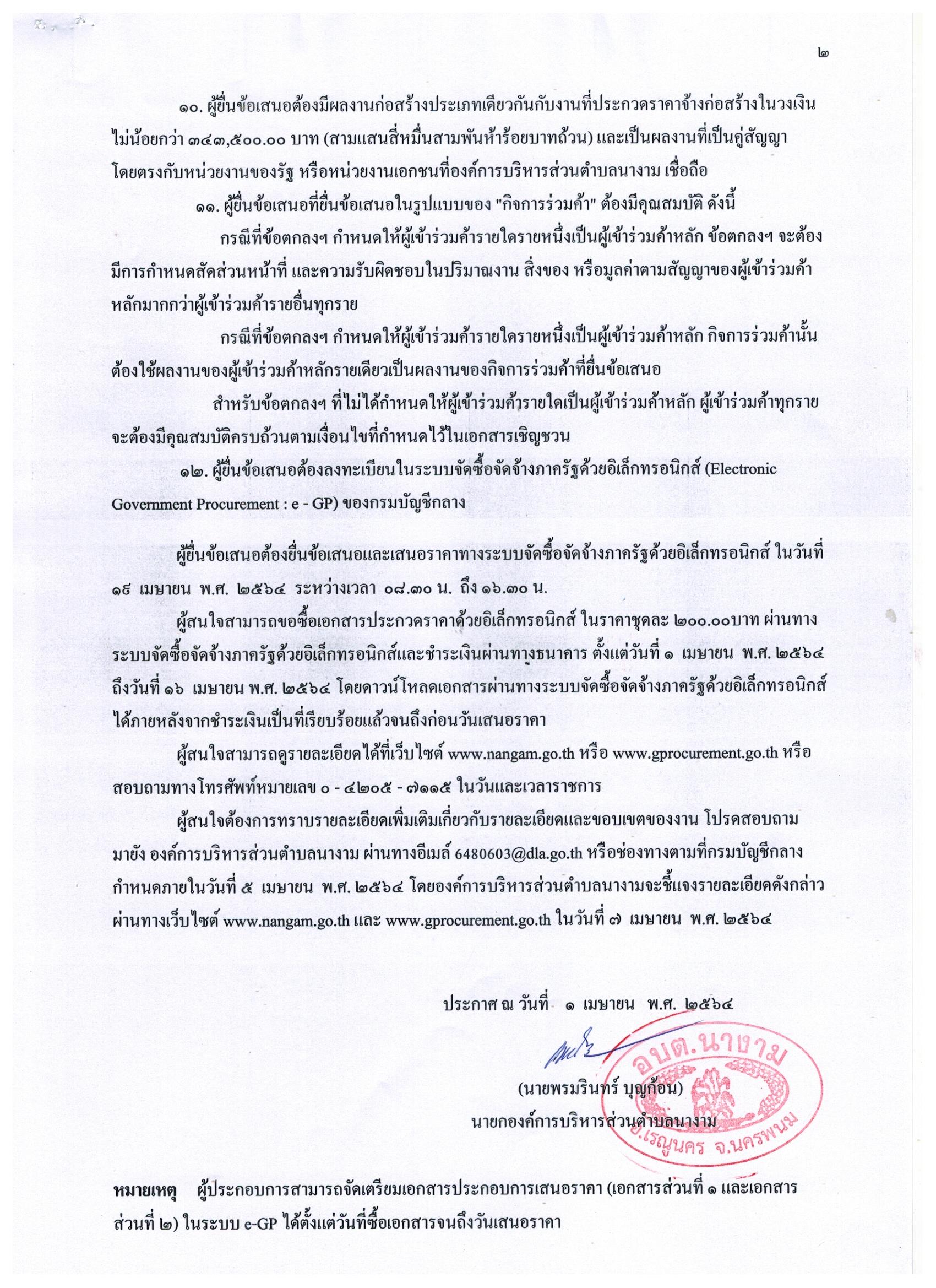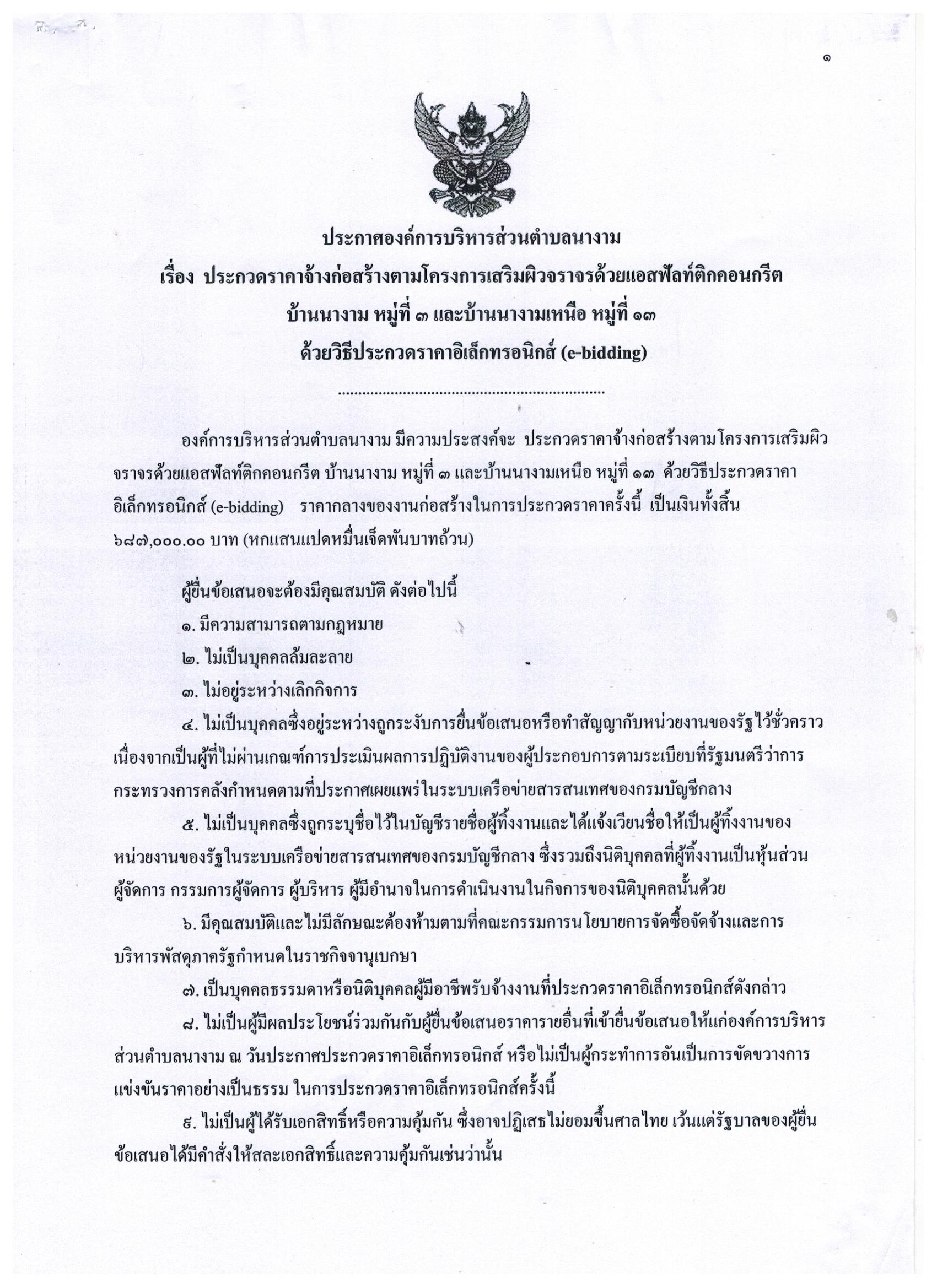ชื่อเรื่อง : ประกาศ เรื่อง ประกวดราคาจ้างก่อสร้างโครงการเสริมผิวจราจรด้วยแอสฟัลท์ติกคอนกรีต บ้านนางาม หมู่ที่ ๓ และบ้านนางามเหนือ หมู่ที่ ๑๓ ด้วยวิธีประกวดราคาอิเล็กทรอนิกส์ (e-bidding)