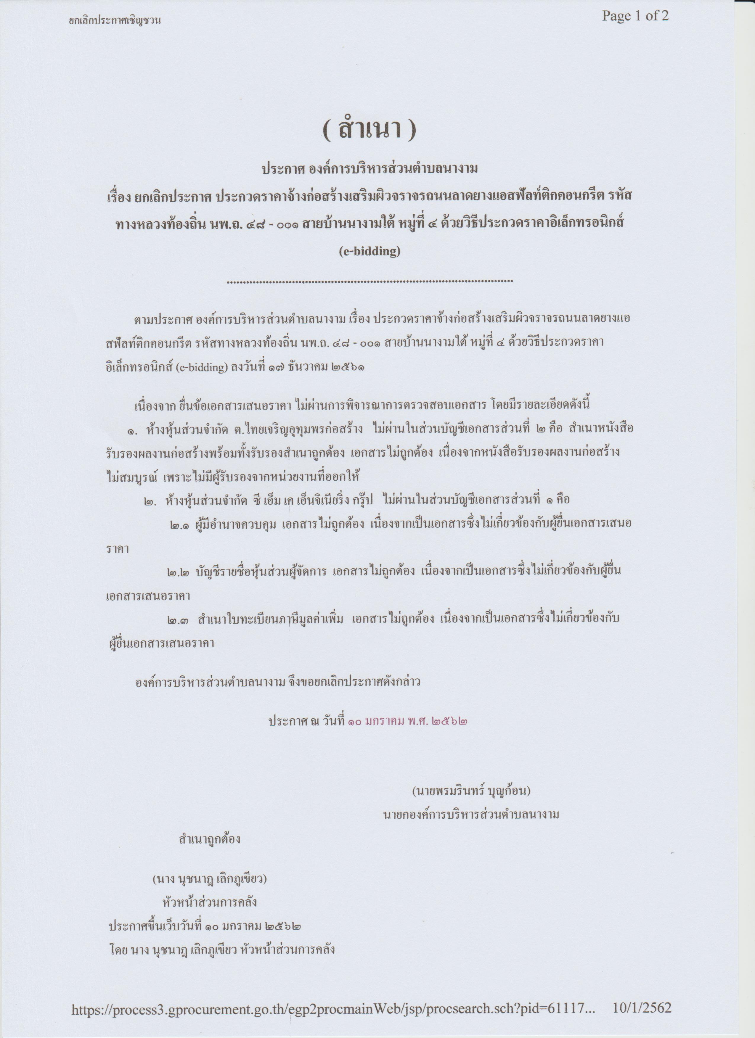 ประกาศยกเลิกประกาศ ประกวดราคาจ้างก่อสร้างเสริมผิวจราจรถนนลาดยางแอสฟัลท์ติกคอนกรีต รหัสทางหลวงท้องถิ่น นพ.ถ. ๔๘ - ๐๐๑ สายบ้านนางามใต้ หมู่ที่ ๔