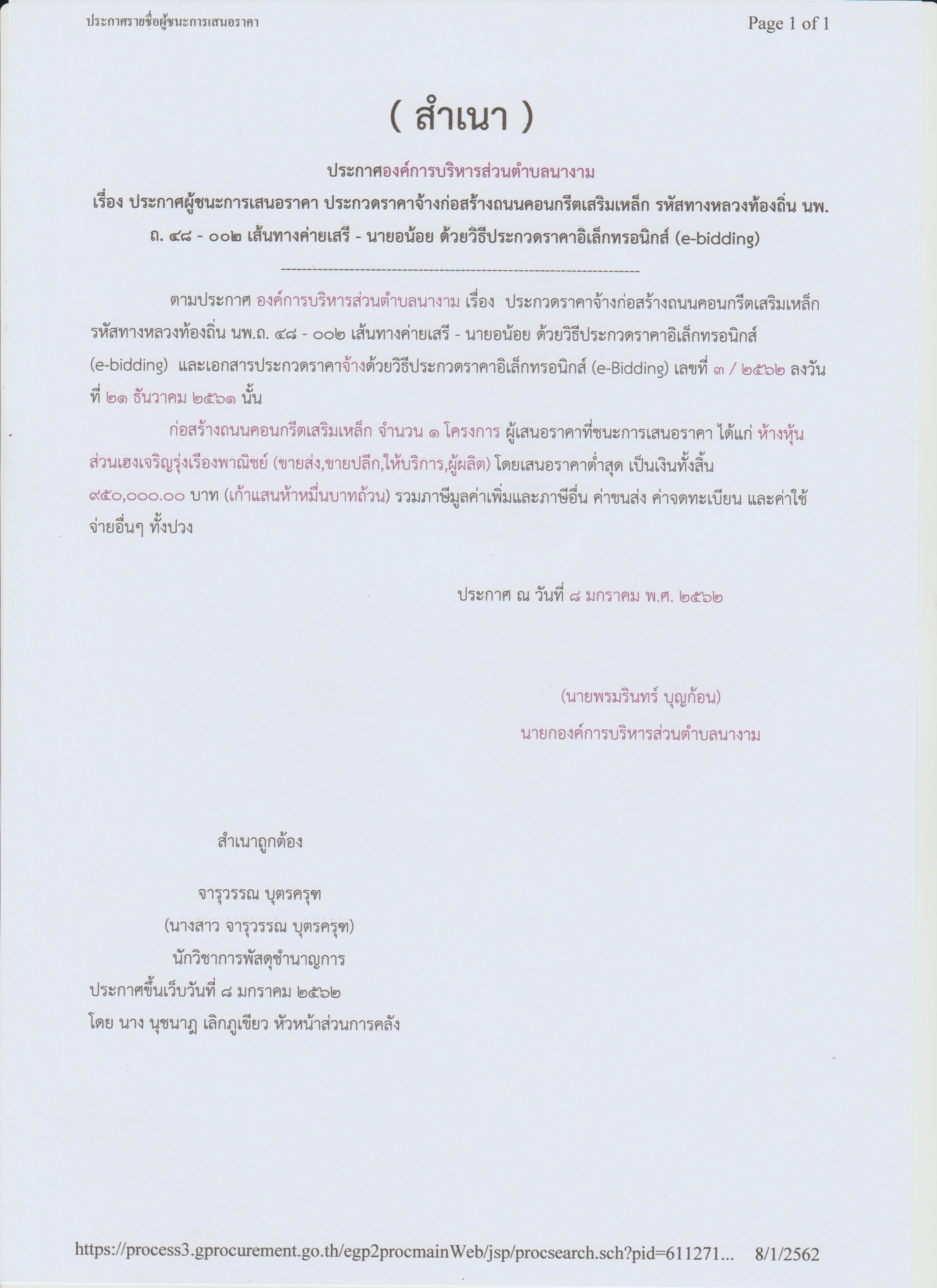 ชื่อเรื่อง : ประกาศผู้ชนะการเสนอราคา ประกวดราคาจ้างก่อสร้างถนนคอนกรีตเสริมเหล็ก รหัสทางหลวงท้องถิ่น นพ.ถ. ๔๘ - ๐๐๒