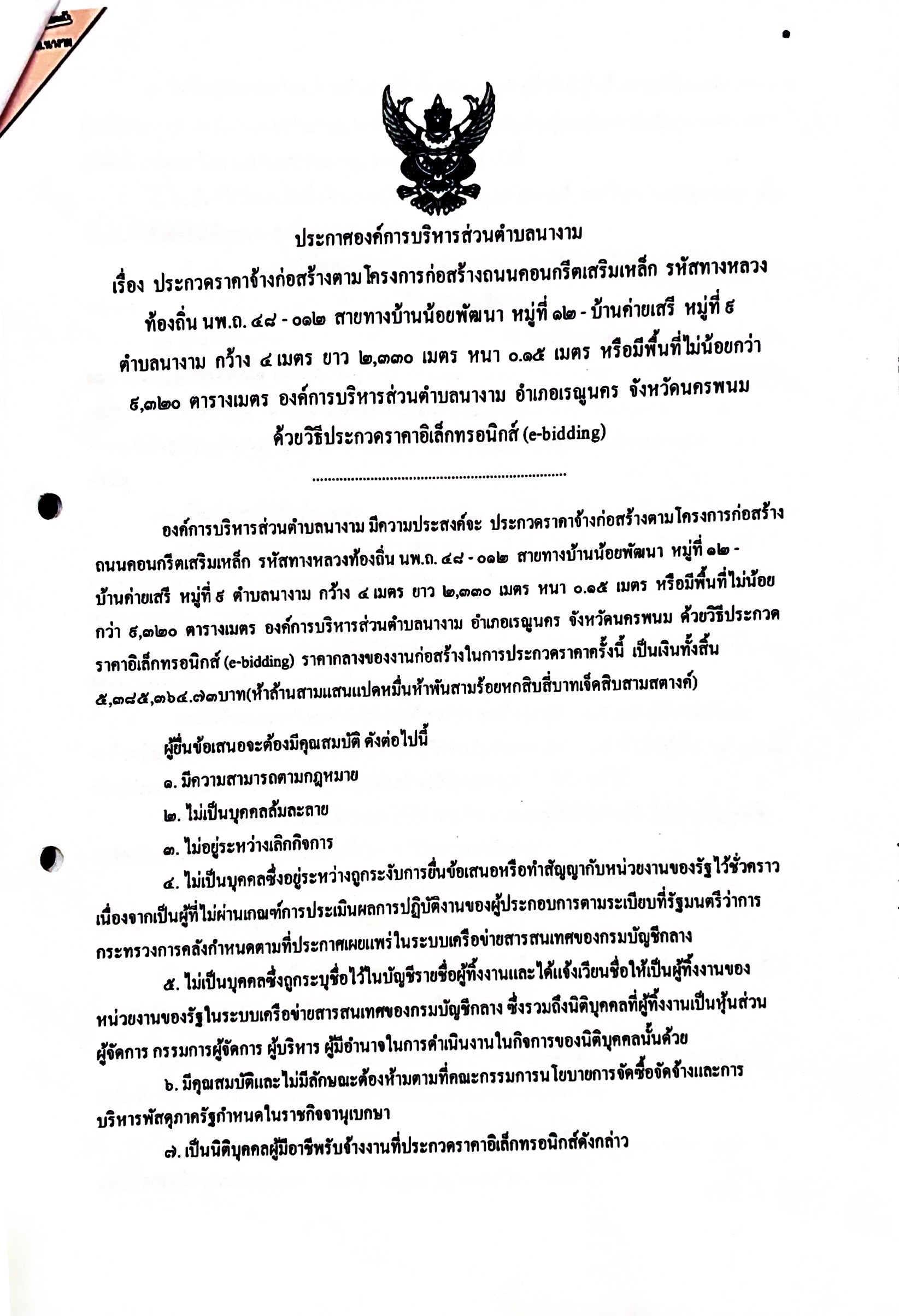 ชื่อเรื่อง : ประกาศประกวดราคาจ้างก่อสร้างตามโครงการก่อสร้างถนนคอนกรีตเสริมเหล็ก รหัสทางหลวงท้องถิ่น นพ.ถ. ๔๘ - ๐๑๒ สายทางบ้านน้อยพัฒนา หมู่ที่ ๑๒ - บ้านค่ายเสรี หมู่ที่ ๙ ตำบลนางาม กว้าง ๔ เมตร ยาว ๒,๓๓๐ เมตร หนา ๐.๑๕ เมตร หรือมีพื้นที่ไม่น้อยกว่า ๙,๓๒