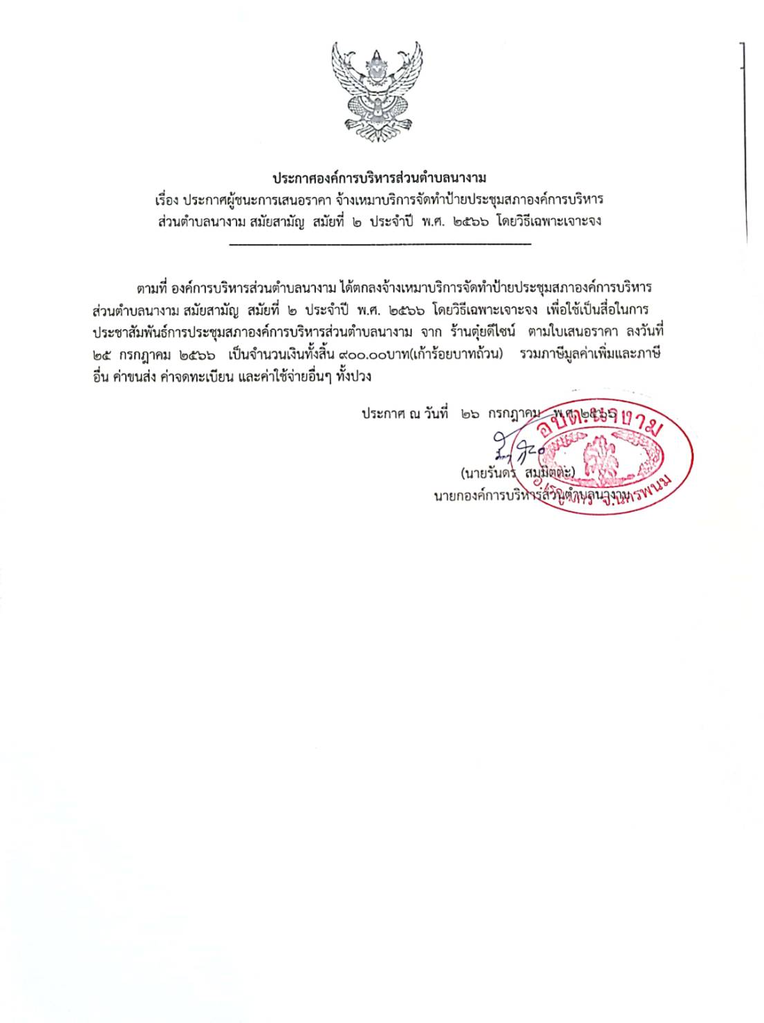 ประกาศผู้ชนะเสนอราคา จ้างเหมาบริการจัดทำป้ายชุมชนสภาองค์การบริหารส่วนตำบลนางาม สมัยสามัญ สมัยที่ ๒ ประจำปี พ.ศ. ๒๕๖๖ โดยวิธีเฉพาะเจาะจง