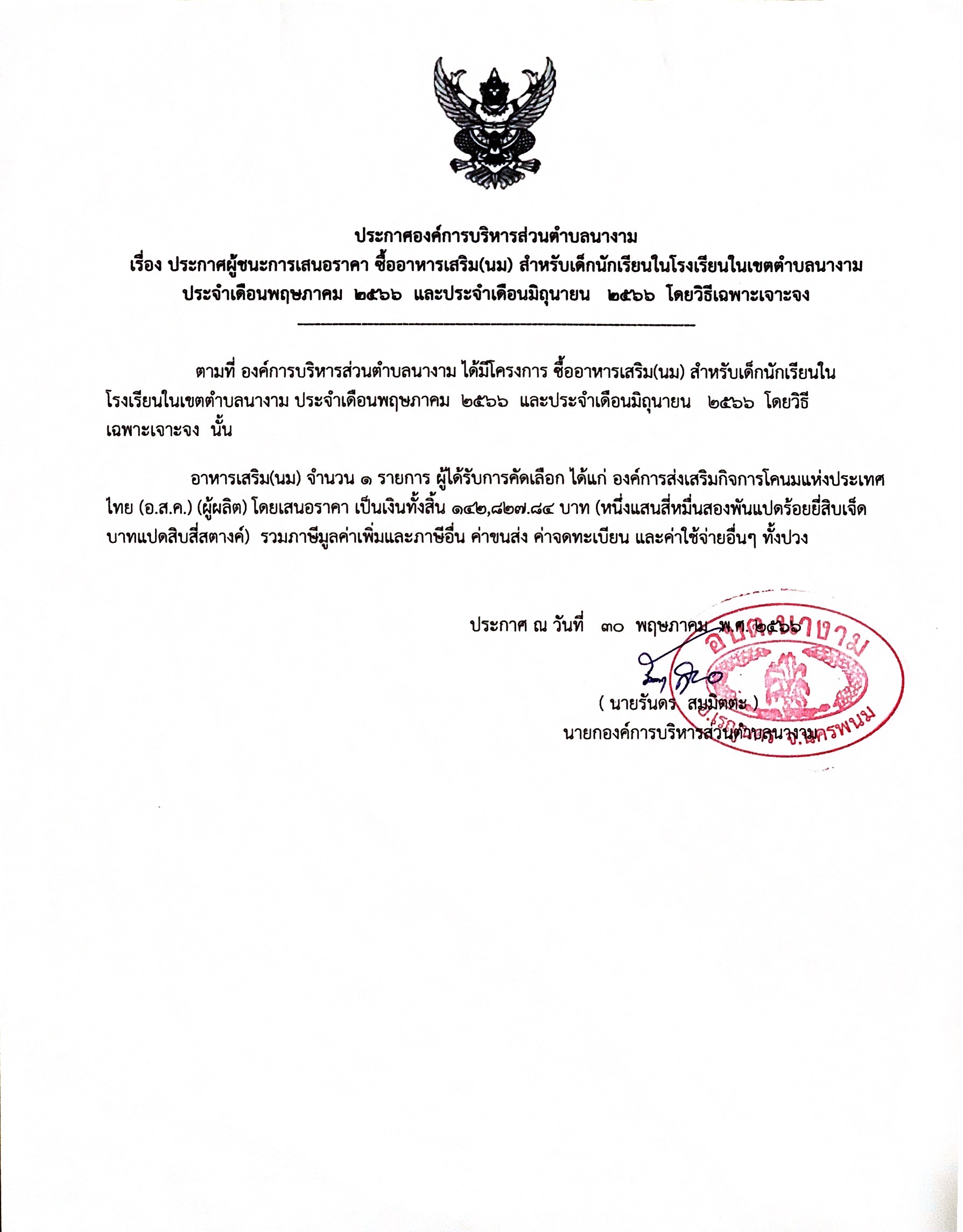 ชื่อเรื่อง : ประกาศผู้ชนะการเสนอราคา ซื้ออาหารเสริม(นม) สำหรับเด็กนักเรียนในโรงเรียนในเขตตำบลนางาม ประจำเดือนพฤษภาคม ๒๕๖๖ และประจำเดือนมิถุนายน ๒๕๖๖ โดยวิธีเฉพาะเจาะจง
