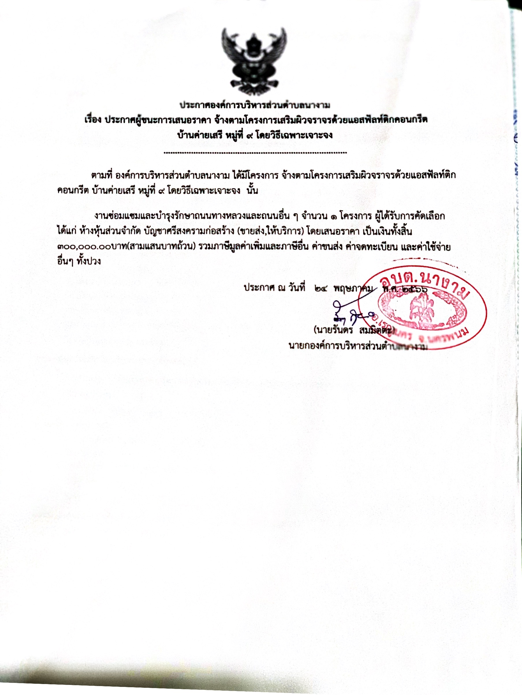 ประกาศผู้ชนะการเสนอราคา จ้างตามโครงการเสริมผิวจราจรด้วยแอสฟัลท์ติกคอนกรีต บ้านค่ายเสรี หมู่ที่ ๙ โดยวิธีเฉพาะเจาะจง