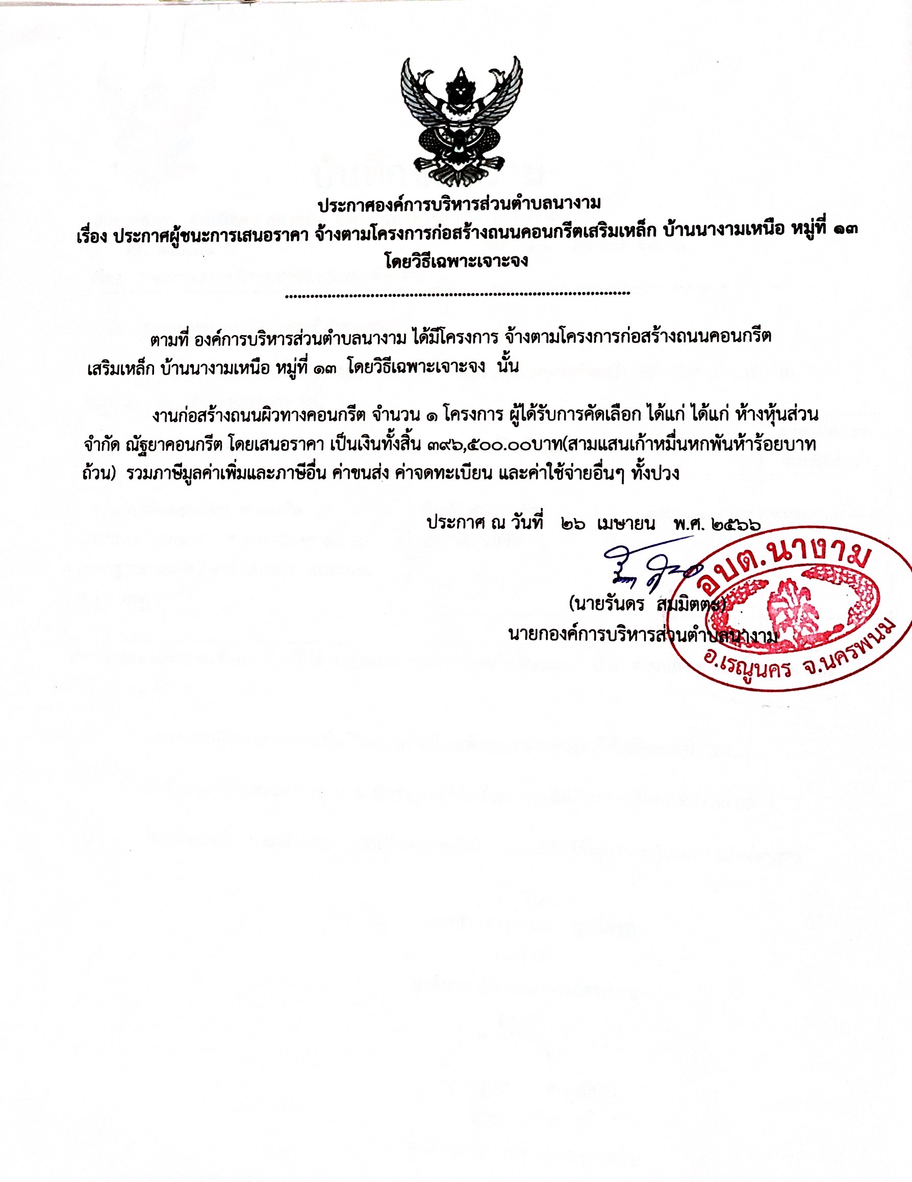 ชื่อเรื่อง : ประกาศผู้ชนะการเสนอราคา จ้างตามโครงการก่อสร้างถนนคอนกรีตเสริมเหล็ก บ้านนางามเหนือ หมู่ที่ 13 โดยวิธีเฉพาะเจาะจง