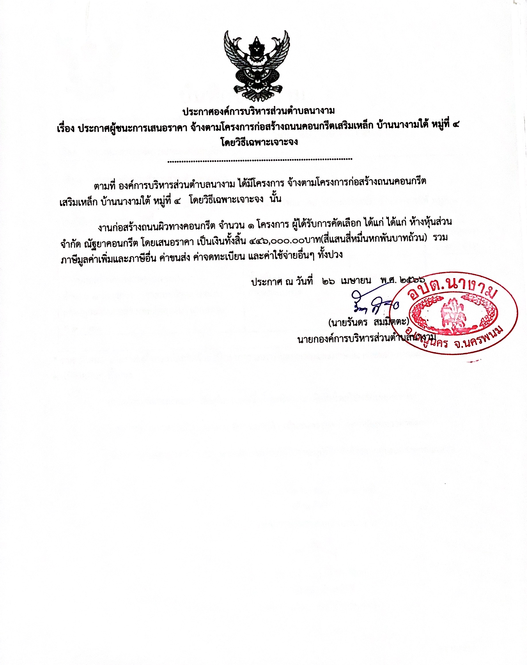 ประกาศผู้ชนะการเสนอราคา จ้างตามโครงการก่อสร้างถนนคอนกรีตเสริมเหล็ก บ้านนางามใต้ หมู่ที่ 4 โดยวิธีเฉพาะเจาะจง