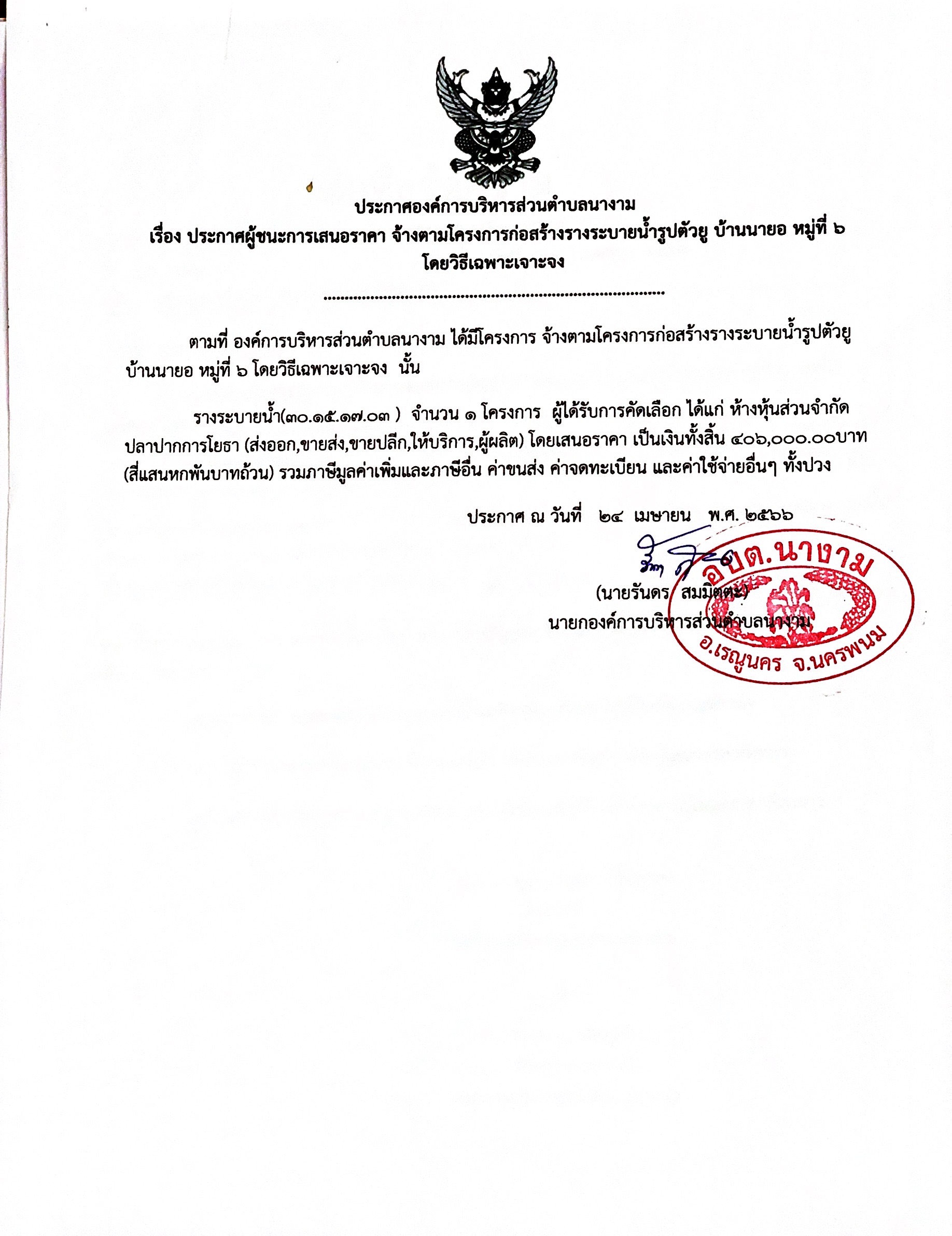 ประกาศผู้ชนะการเสนอราคา จ้างตามโครงการก่อสร้างรางระบายน้ำรูปตัวยู บ้านนายอ หมู่ที่ ๖ โดยวิธีเฉพาะเจาะจง