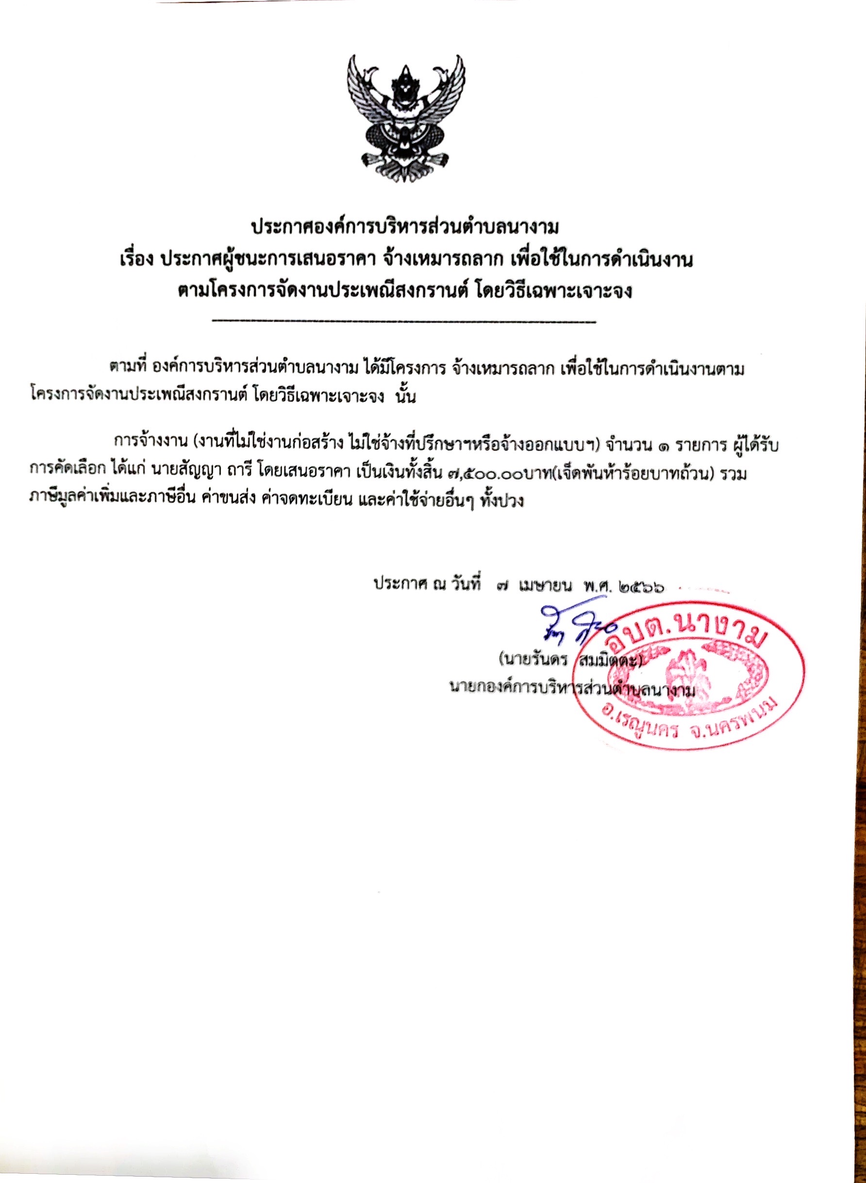 ชื่อเรื่อง : ประกาศผู้ชนะการเสนอราคา จ้างเหมารถลาก เพื่อใช้ในการดำเนินงานตามโครงการจัดงานประเพณีสงกรานต์