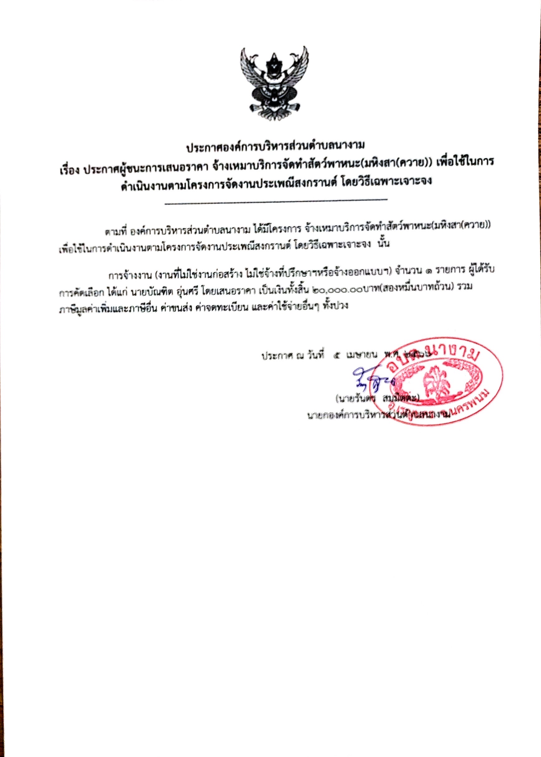 ประกาศผู้ชนะการเสนอราคา จ้างเหมาบริการจัดทำสัตว์พาหนะ(มหิงสา(ควาย)) เพื่อใช้ในการดำเนินงานตามโครงการจัดงานประเพณีสงกรานต์