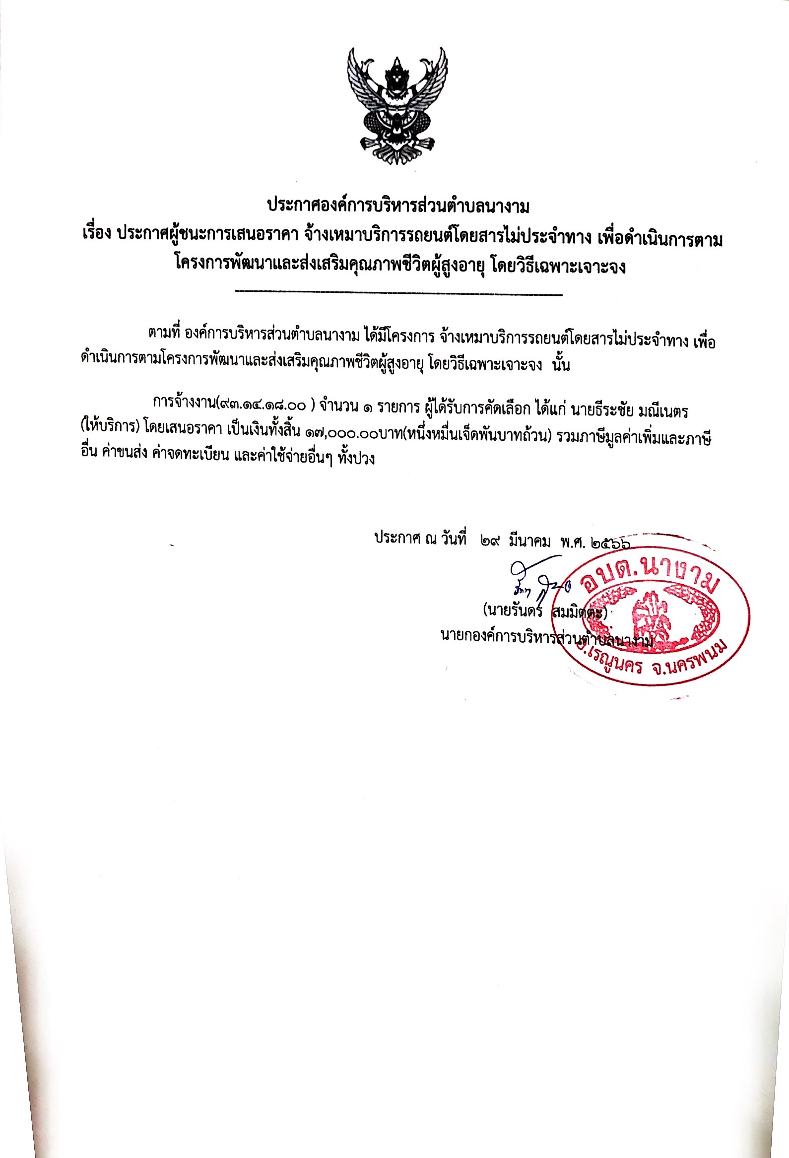 ประกาศผู้ชนะการเสนอราคา จ้างเหมาบริการรถยนต์โดยสารไม่ประจำทาง เพื่อดำเนินการตามโครงการพัฒนาและส่งเสริมคุณภาพชีวิตผู้สูงอายุ โดยวิธีเฉพาะเจาะจง