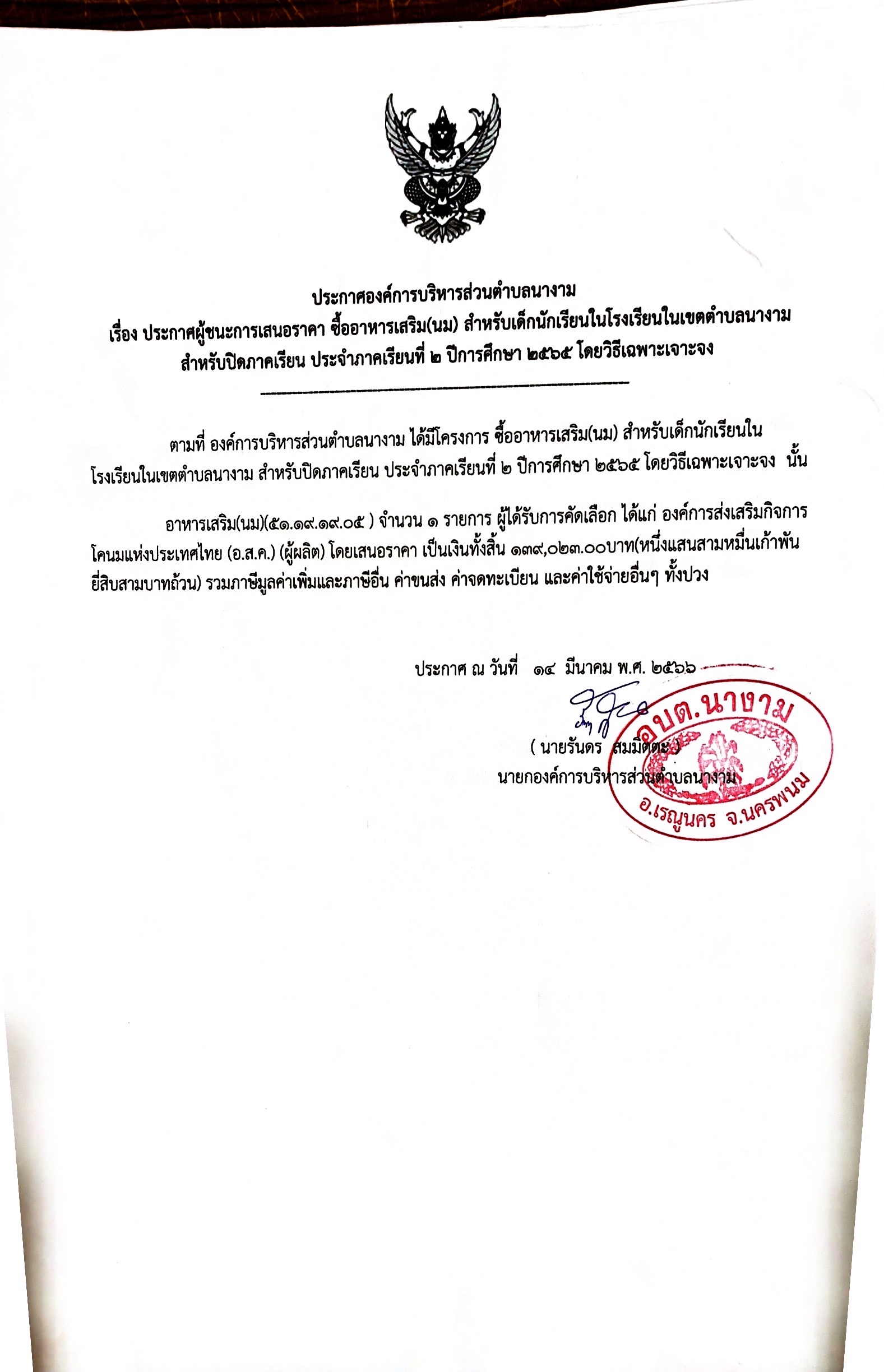 ประกาศผู้ชนะการเสนอราคา ซื้ออาหารเสริม(นม) สำหรับเด็กนักเรียนในโรงเรียนในเขตตำบลนางาม สำหรับปิดภาคเรียน ประจำภาคเรียนที่ ๒ ปีการศึกษา ๒๕๖๕ โดยวิธีเฉพาะเจาะจง