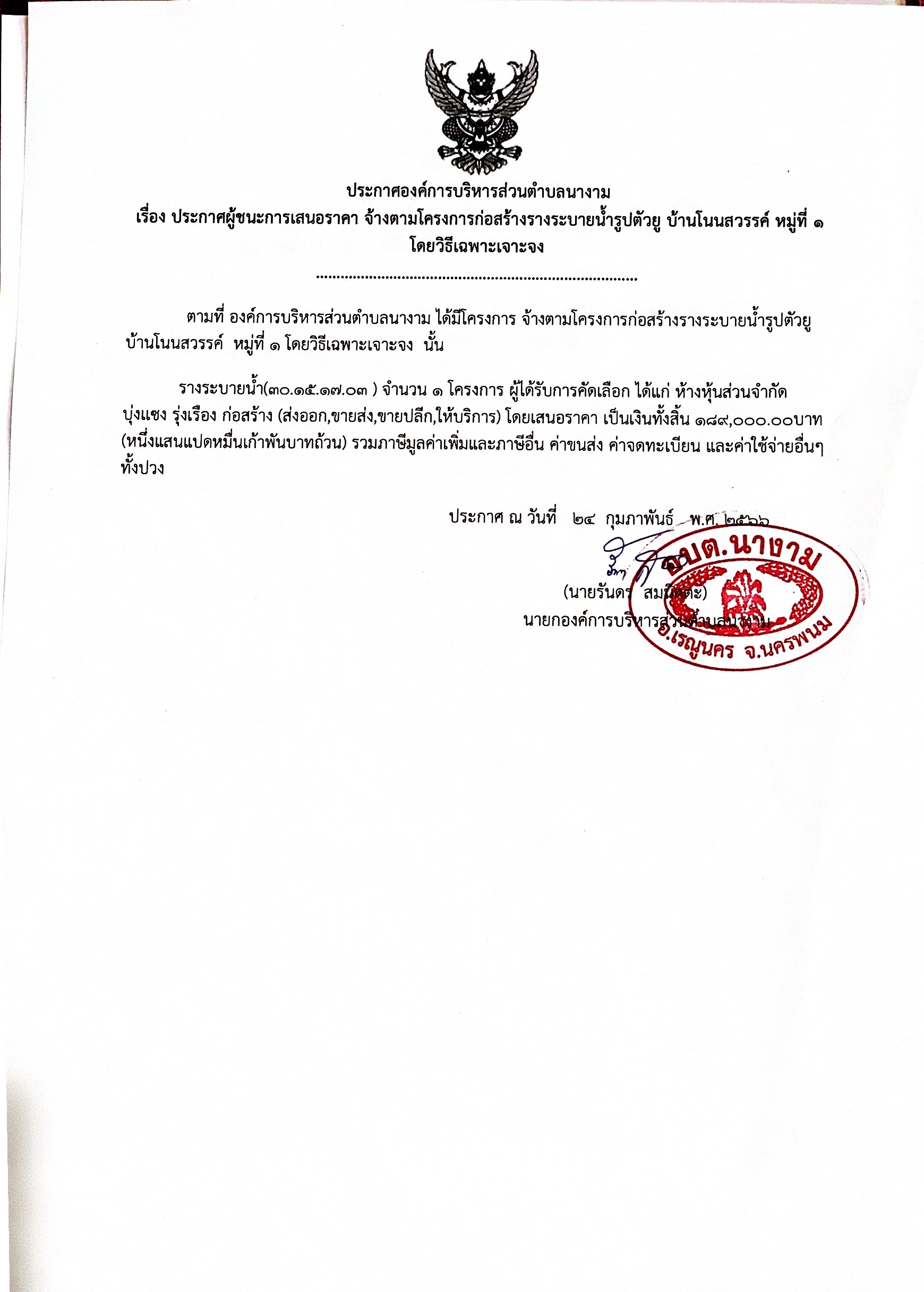ประกาศผู้ชนะการเสนอราคา จ้างตามโครงการก่อสร้างรางระบายน้ำรูปตัวยู บ้านโนนสวรรค์ หมู่ที่ ๑ โดยวิธีเฉพาะเจาะจง