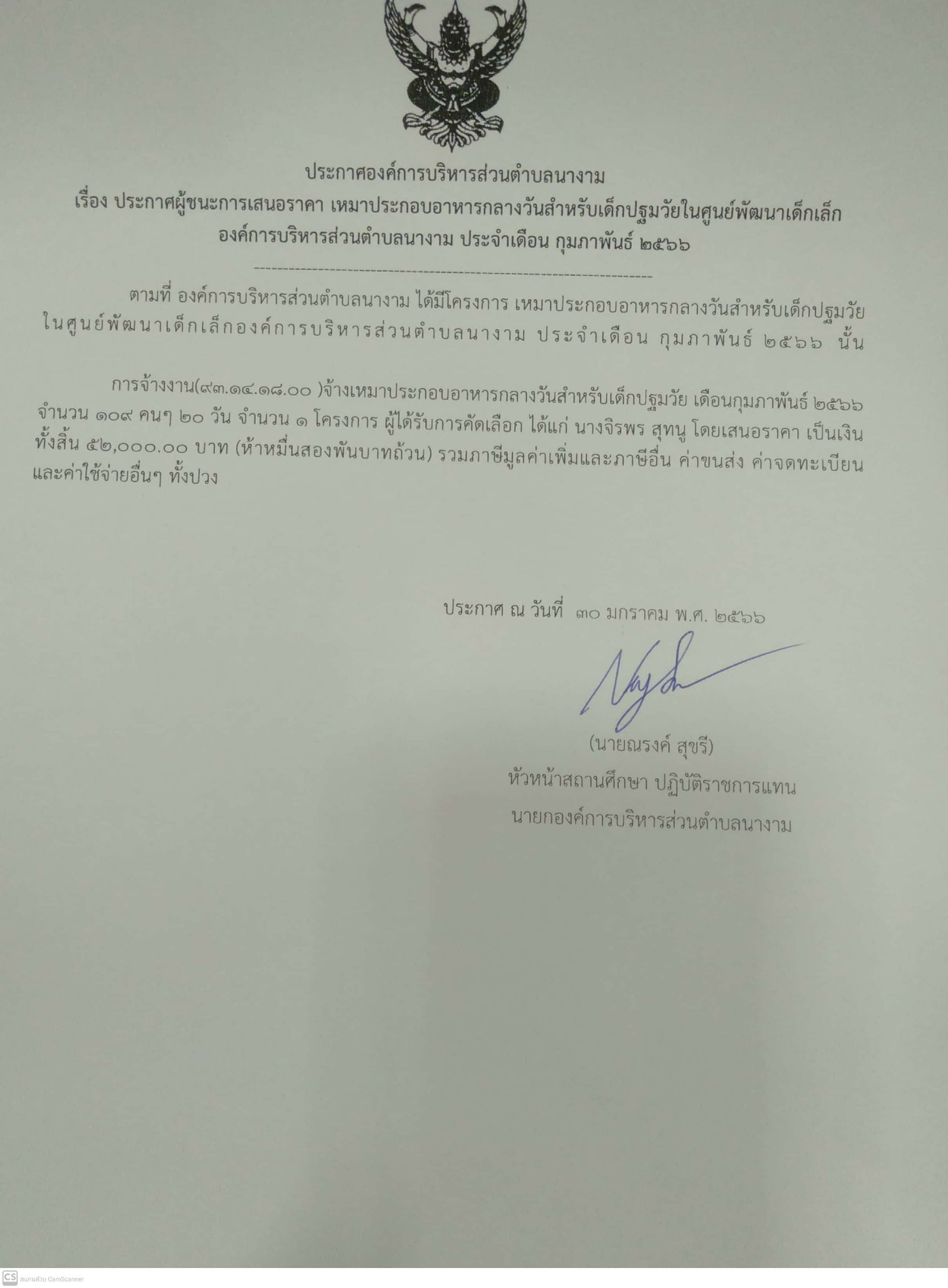 ประกาศผู้ชนะการเสนอราคาจ้างประกอบอาหารกลางวันศูนย์พัฒนาเด็กเล็กองค์การบริหารส่วนตำบลนางามเดือนกุมภาพันธ์ 2566 โดยวิธีเฉพาะเจาะจง