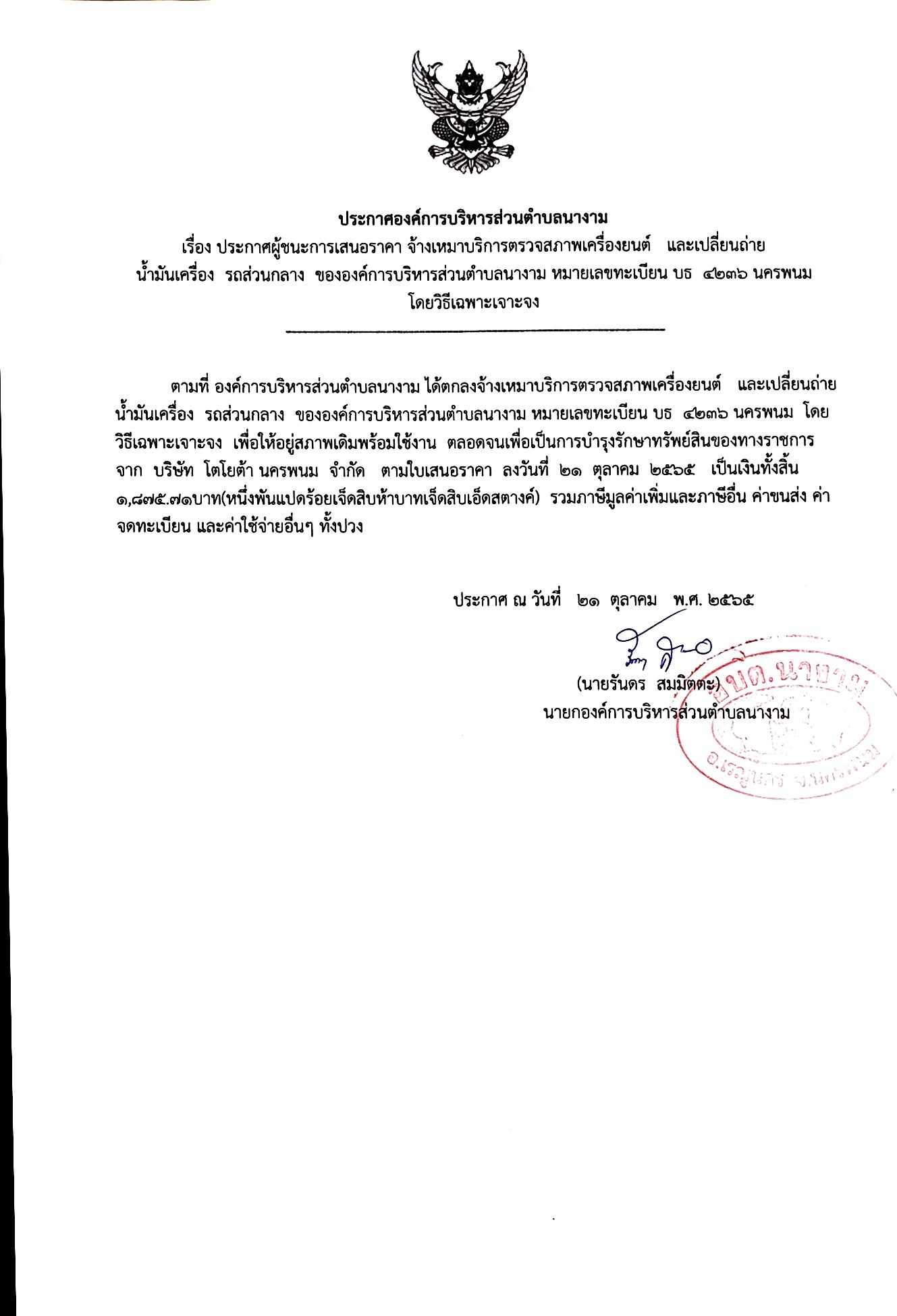 ชื่อเรื่อง : ประกาศผู้ชนะการเสนอราคา จ้างเหมาบริการตรวจสภาพเครื่องยนต์ และเปลี่ยนถ่าย น้ำมันเครื่อง รถส่วนกลาง ขององค์การบริหารส่วนตำบลนางาม หมายเลขทะเบียน บธ ๔๒๓๖ นครพนม โดยวิธีเฉพาะเจาะจง