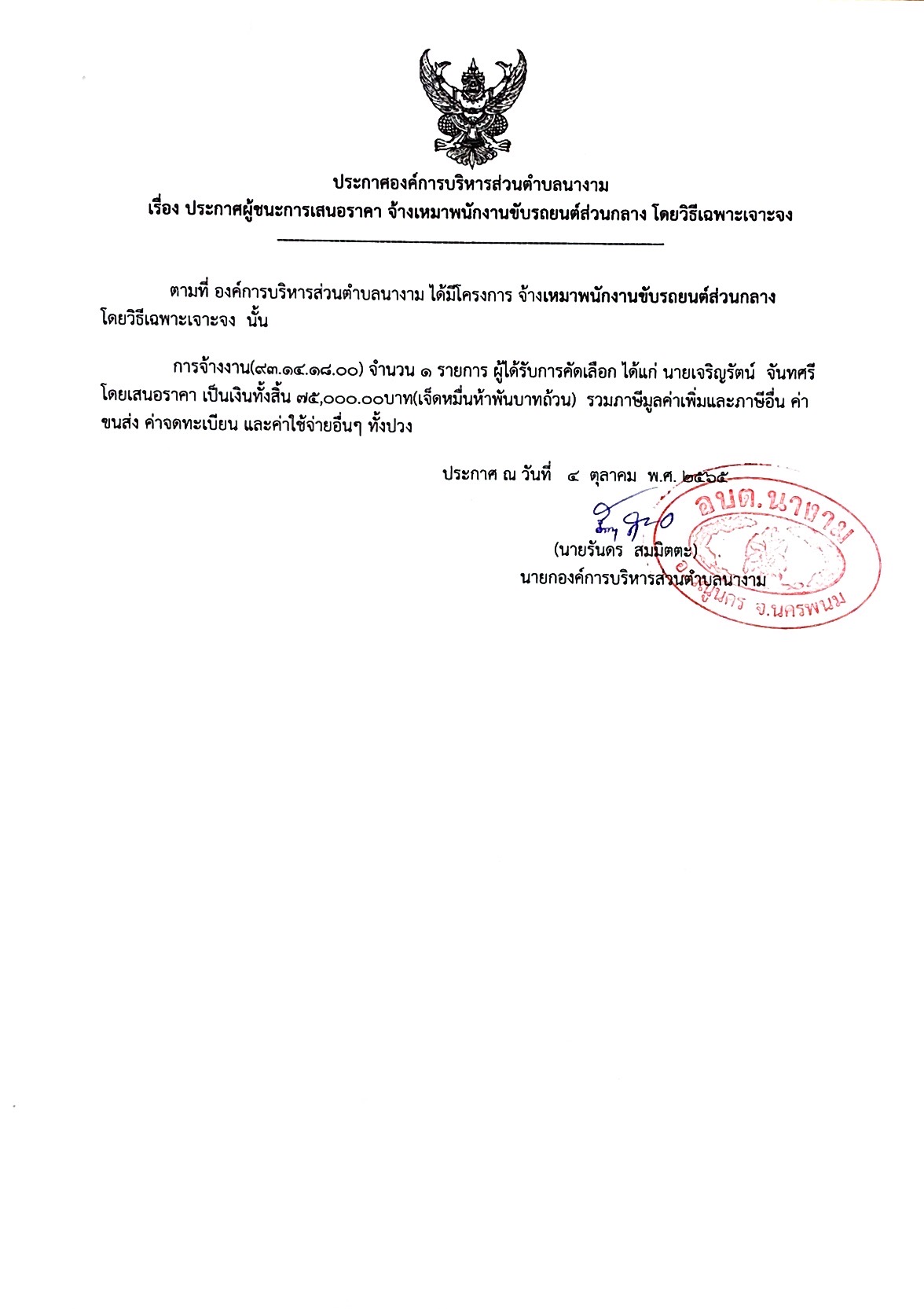 ประกาศผู้ชนะการเสนอราคา จ้างเหมาพนักงานขับรถยนต์ส่วนกลาง โดยวิธีเฉพาะเจาะจง