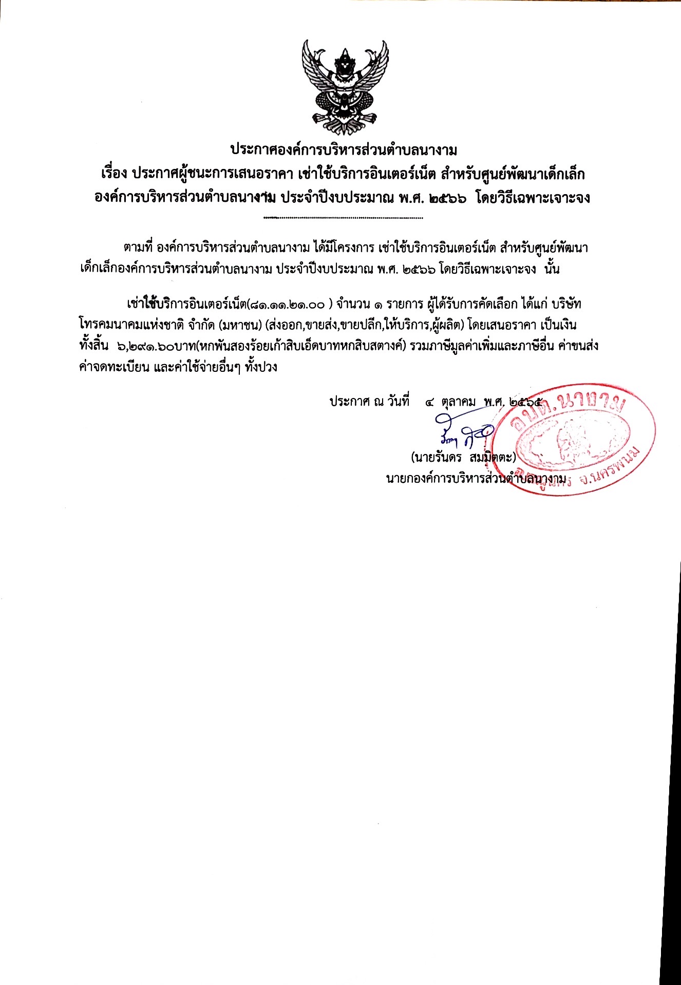 ประกาศผู้ชนะการเสนอราคา เช่าใช้บริการอินเตอร์เน็ต สำหรับศูนย์พัฒนาเด็กเล็ก องค์การบริหารส่วนตำบลนางาม ประจำปีงบประมาณ พ.ศ. ๒๕๖๖ โดยวิธีเฉพาะเจาะจง