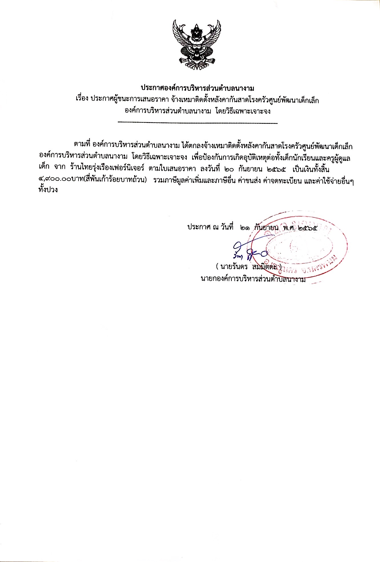 ประกาศผู้ชนะการเสนอราคา จ้างเหมาติดตั้งหลังคากันสาดโรงครัวศูนย์พัฒนาเด็กเล็ก องค์การบริหารส่วนตำบลนางาม โดยวิธีเฉพาะเจาะจง