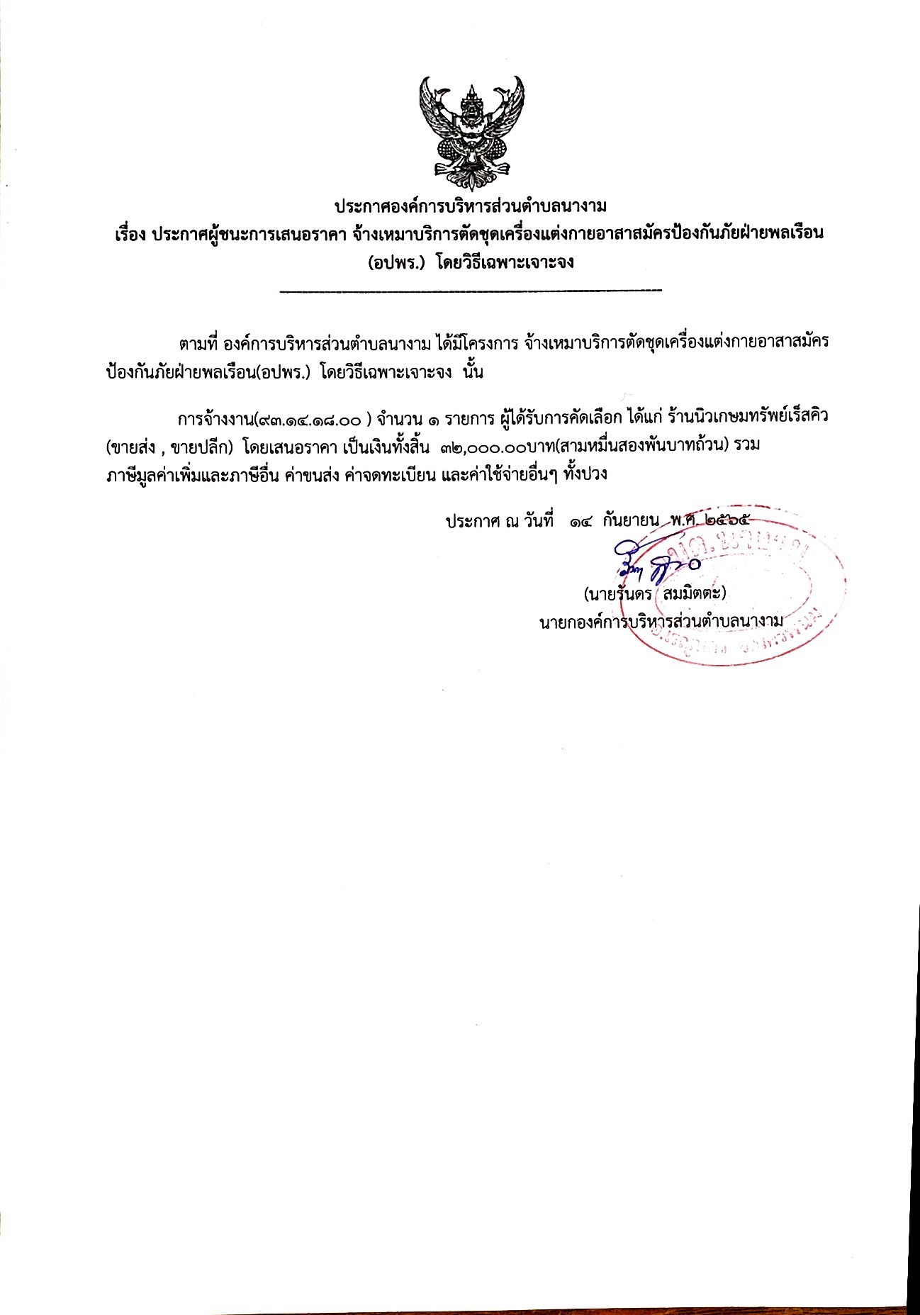 ชื่อเรื่อง : ประกาศผู้ชนะการเสนอราคา จ้างเหมาบริการตัดชุดเครื่องแต่งกายอาสาสมัครป้องกันภัยฝ่ายพลเรือน(อปพร.) โดยวิธีเฉพาะเจาะจง
