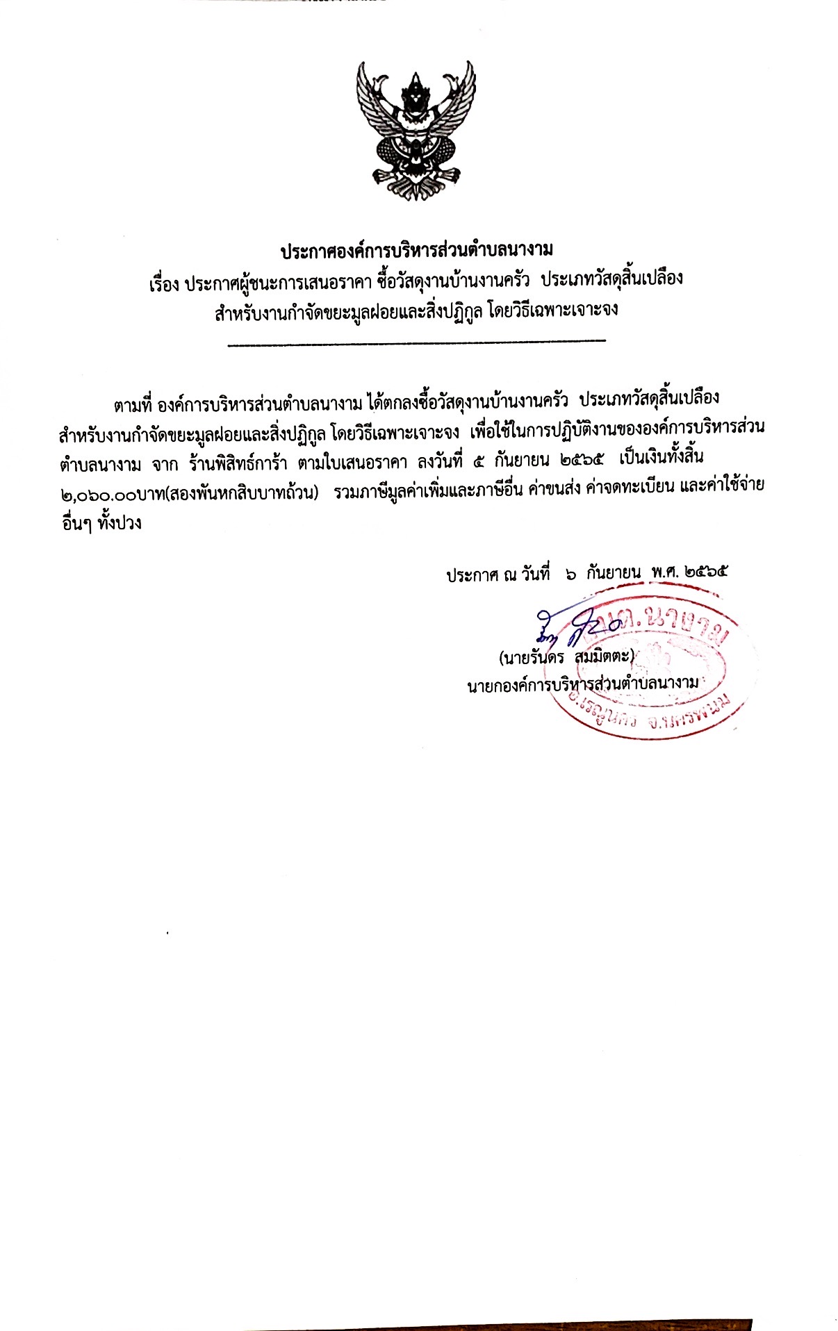 ประกาศผู้ชนะการเสนอราคา ซื้อวัสดุงานบ้านงานครัว ประเภทวัสดุสิ้นเปลือง สำหรับงานกำจัดขยะมูลฝอยและสิ่งปฏิกูล โดยวิธีเฉพาะเจาะจง