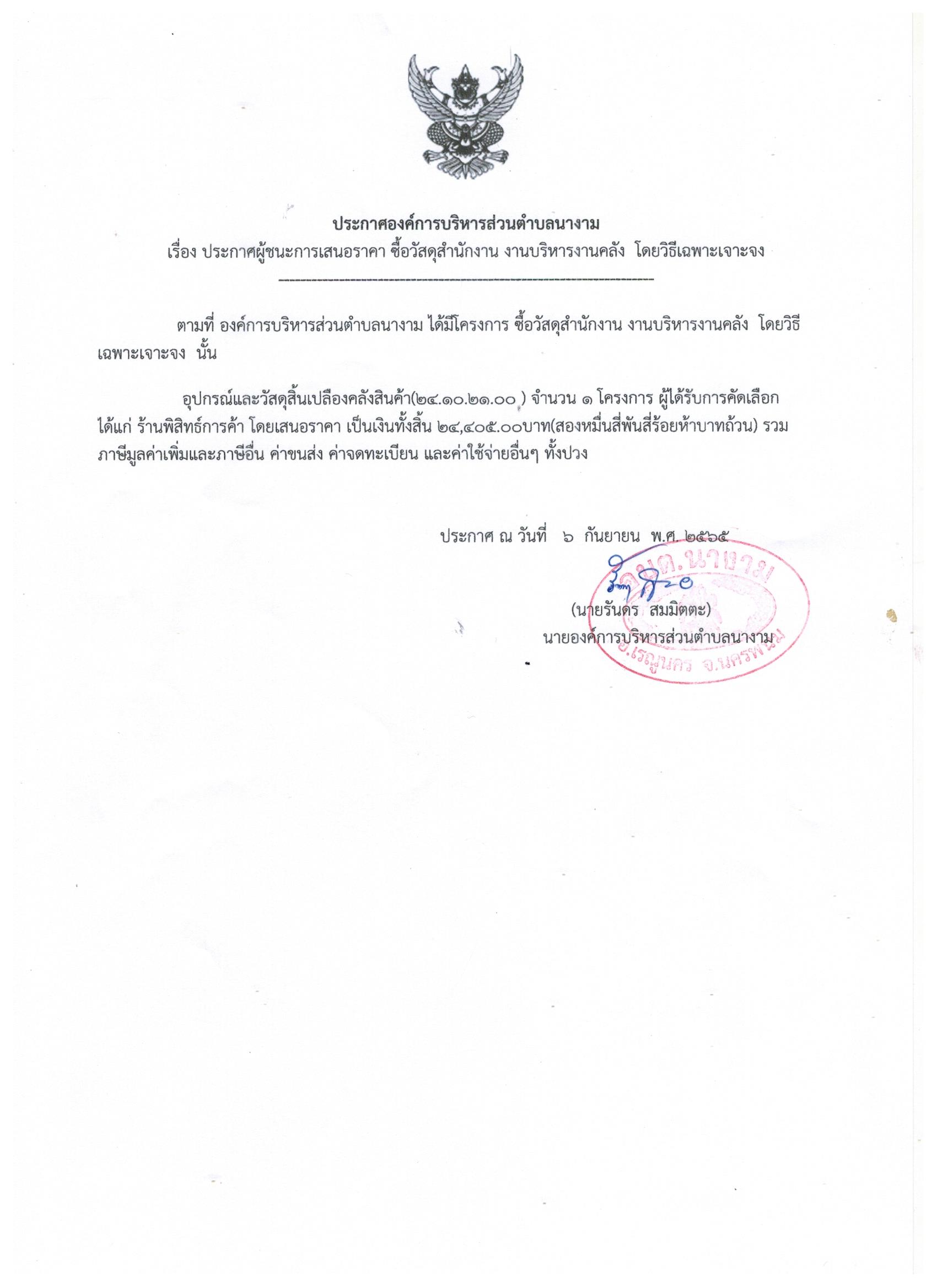 ประกาศผู้ชนะการเสนอราคา ซื้อวัสดุสำนักงาน งานบริหารงานคลัง โดยวิธีเฉพาะเจาะจง